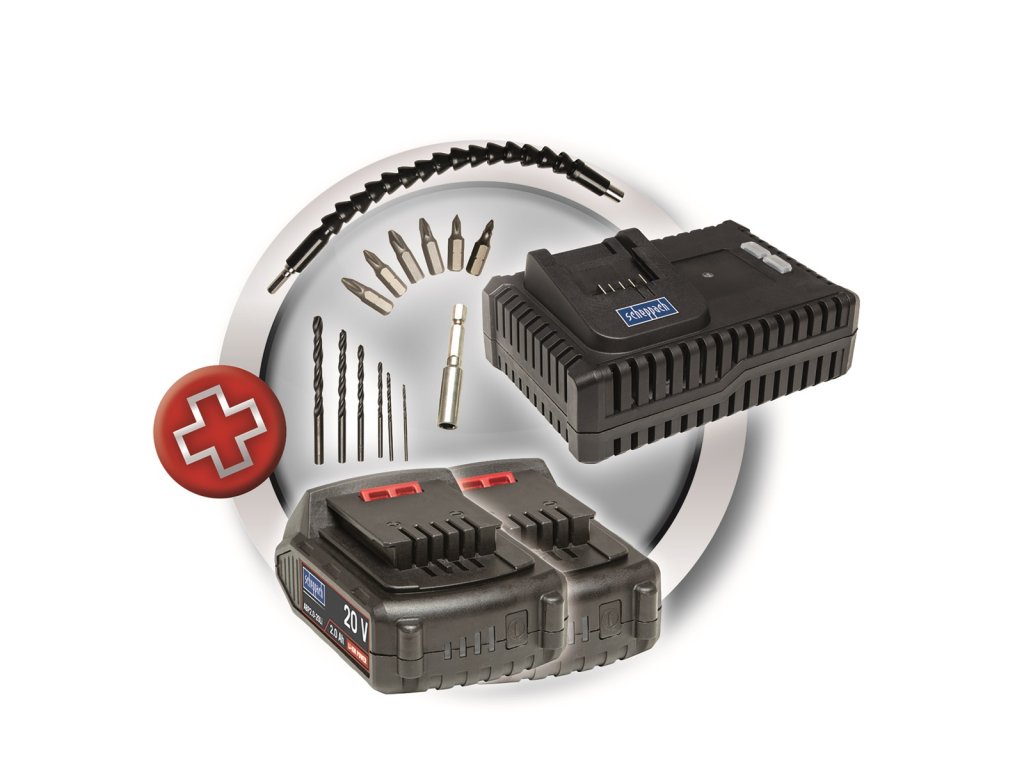 aku 20V vrtací šroubovák + 2x baterie 2 Ah + nabíječka + kufr Scheppach CSD40-20Li + 9 mm nôž odlamovací, plastový