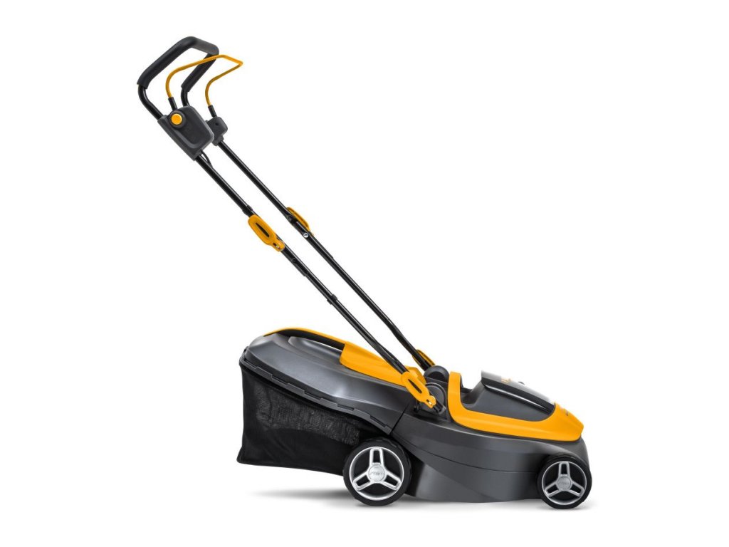 nastaviteľnou do dvoch polôh a praktickým madlom pre ľahké zdvíhanie. Pokiaľ ide o kosenie, 34 cm široký nôž môže byť nastavený do 6 polôh, podľa potreby obsluhy. Pokosená tráva je ukladaná do 35l hybridného koša s