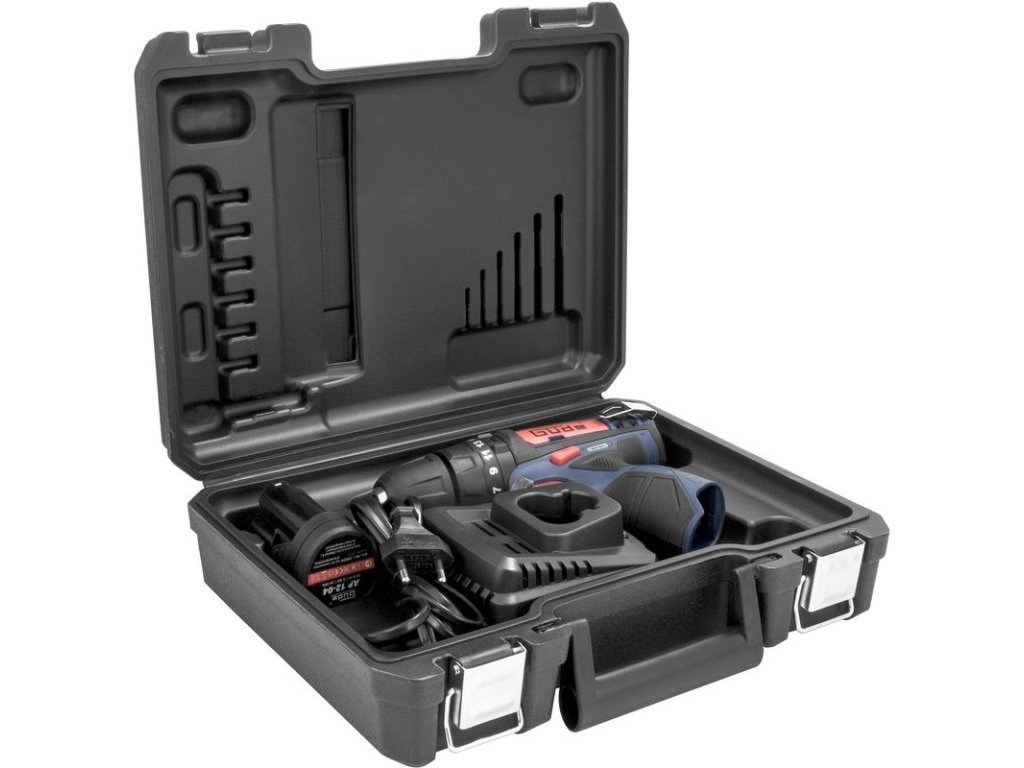 Akumulátorový vŕtací skrutkovač s príklepom zo série akumulátorového náradia 12V E3, dlhý len 185 mm. Silný a vysoko výkonný mechanizmus príklepu. 2-rýchlostná prevodovka k optimálnemu využitiu výkonu pre rôzne materiály. 10 mm rýchloupínacie skľučovadlo. Automatická aretácia vretena. Elektronika s reguláciou otáčok a ochranou proti preťaženiu. Pravo/ľavobežný chod s brzdou motora. 20 + 1 stupňov krútiaceho momentu. Pogumovaná rukoväť pre bezpečnú prácu. Klip na opasok. Ukazovateľ kapacity akumulátora. Integrovaná LED k osvetleniu pracovnej oblasti. Akumulátor 12 V / 2,0 Ah Lithium Power s kontrolou jednotlivých článkov a ochranou voči preťaženiu, rýchlonabíjačka 2,0 A. Kufor s kovovými sponami, 13-dielna sada vrtákov a bitov obsahuje: 6x HSS vrtáky (Ø 1,5, Ø 2,5, Ø 3,0, Ø 4,0, Ø 5,0, Ø 6,0), 6x Cr-V bity (Ø 5, Ø 6, PH1, PH2, PZ1, PZ2), 1x držiak bitov 55mm – magnetický.Napätie akumulátora: 12 VTyp akumulátora: Li-IonKapacita akumulátora: 2,0 AhVýkon: 24 WhDoba nabíjania akumulátorov: 72 min.Počet otáčok na prázdno (1. stupeň): 0 - 400 min-1Počet otáčok na prázdno (2. stupeň): 0 - 1300 min-1Frekvencia príklepu pri zaťažení (1.stupeň): 0 - 6000 min-1Frekvencia príklepu pri zaťažení (2.stupeň): 0 - 19 500 min-1Maximálny krútiaci moment: 25 NmMinimálny upínací rozsah skľučovadla: 0,8 mmMaximálny upínací rozsah skľučovadla: 10 mmMateriál skľučovadla: plastMaximálny priemer vrtu do dreva: 20 mmMaximálny priemer vrtu do ocele: 10 mmMaximálny priemer vrtu do muriva: 10 mmSkrutkovanie do dreva do Ø: 6 mmNabíjací prúd nabíjačky: 2,0 AHmotnosť netto/brutto: 2,2 kg/2,5 kgDodatočné parametre