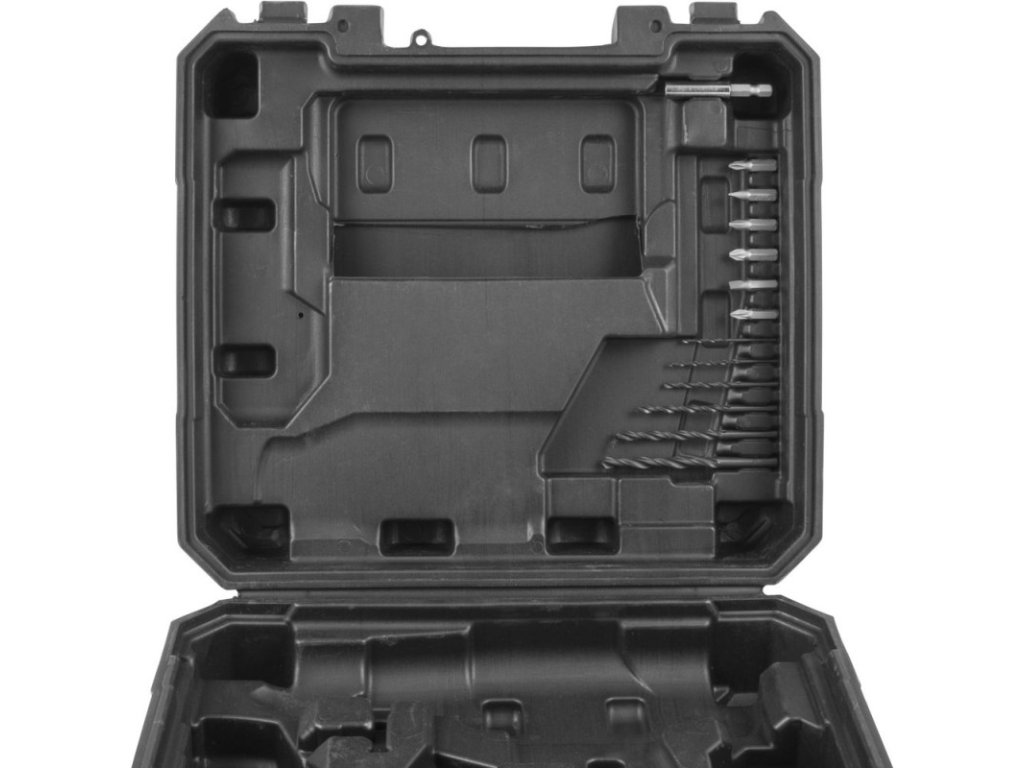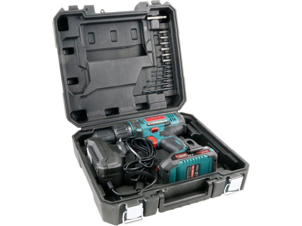 Akumulátorový vŕtací skrutkovač s pravo/ľavobežným chodom, 2 prevodové stupne, rýchloupínacie skľučovadlo 10 mm, automatická aretácia vretena, elektronická regulácia otáčok, 21 stupňov krútiaceho momentu, Softgrip rukoväť, prídavná rukoväť, pracovné LED osvetlenie, signalizácia stavu nabitia. Magnetický držiak bitov, háčik na opasok. Vrátane batérie 2 Ah, rýchlonabíjačky 2,4 A, kufríka a príslušenstva: 6 x HSS vrtáky (Ø 2,0; 2,5; 3,0; 4,0; 5,0; 6,0), 6 x CR-V bity (SL5; SL6; PH1; PH2; PZ1; PZ2), 1 x CR-V bit PZ2 50 mm, 1 x držiak bitov 55 mm magnetický.