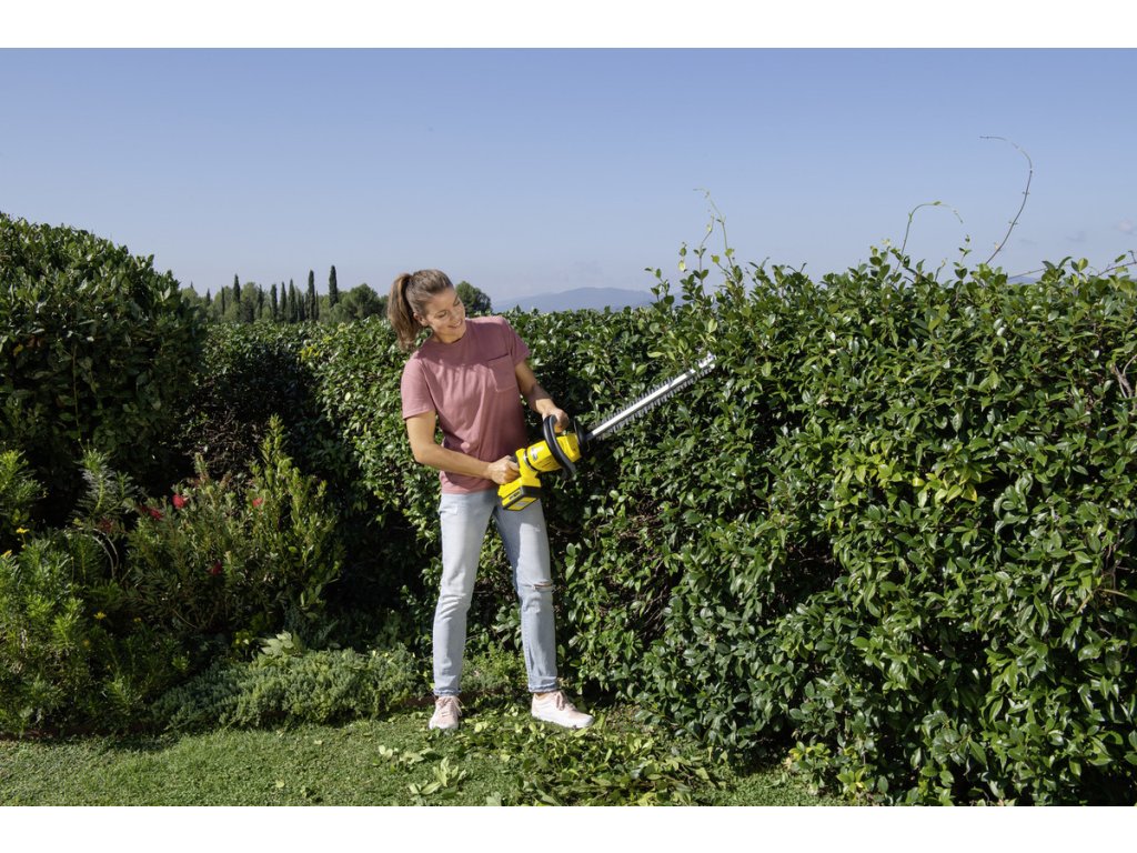 Už žiadne unavené plecia a ramená pri práci: Vďaka otočnej rukoväti o 180 ° zaisťujú akumulátorové nožnice na živý plot HGE 18-50 Battery pohodlnú pracovnú polohu za všetkých okolností, napríklad pri vertikálnych rezoch. Dvojručný bezpečnostný obvod bráni neúmyselnému spusteniu zariadenia. Funkcia píly robí rezanie hrubších vetiev hračkou. Lišta na zametanie odrezkov zachytáva odrezky, ktoré by inak skončili v živom plotei. Čepeľ na akumulátorových nožniciach na živý plot je kosoštvorcová, a preto zanecháva presné výsledky rezania. Dodatočný chránič čepele, s integrovaným okom chráni budovy, podlahy a samotnú čepeľ pred poškodením a umožňuje zavesenie zariadenia na stenu, čím sa šetrí priestor. Jedna batéria a rýchlonabíjačka sú súčasťou dodávky.