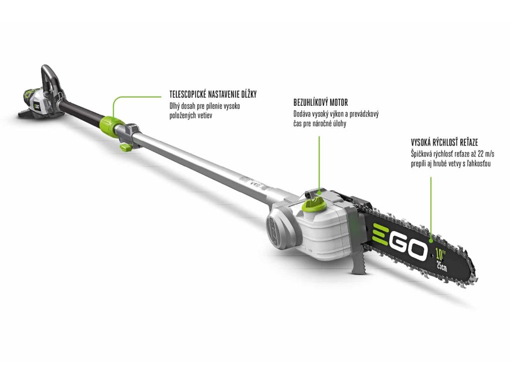 Pre použitie s EGO POWER+ Professional-X Telescopickou Tyčou PPX1000 (predáva sa osobitne). Výkonný bezuhlíkový motor prináša rýchlosť reťaze až 22 m/s pre čistý a presný rez a umožňuje píliť konáre do hrúbky až 200 mm s ľahkosťou. Výborná ergonómia a manévrovateľnosť umožňujú odrezať konáre vo výške až 5 m bez potreby rebríka, čím sa znižuje riziko úrazu pri práci.