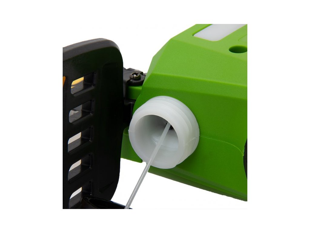 AKU jednoruční řetězová pila je díky svým kompaktím rozměrům užitečným pomocníkem při prořezávání stromů a keřů při práci v omezeném prostoru. Její provoz je v porovnání s většími stroji tichý. Je vybavena ochranou proti zpětnému rázu a bezpečnostním krytem pilového řetězu. Stroj je dodávaný včetně vodící lišty a pilového řetězu v kartonu s montážním klíčem a nádobou na mazací olej - bez akumulátoru a nabíječky.