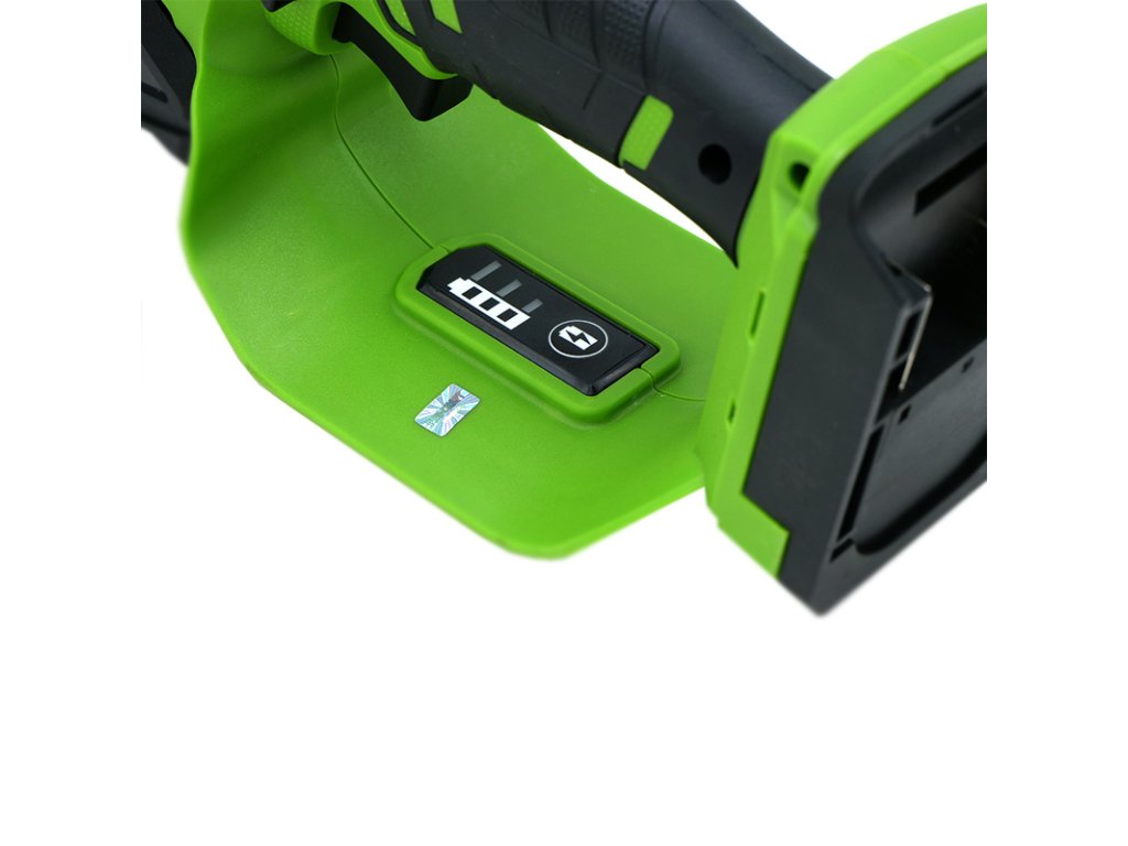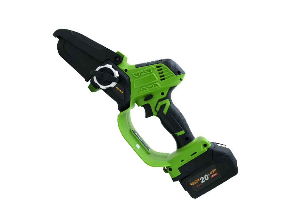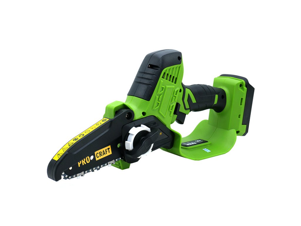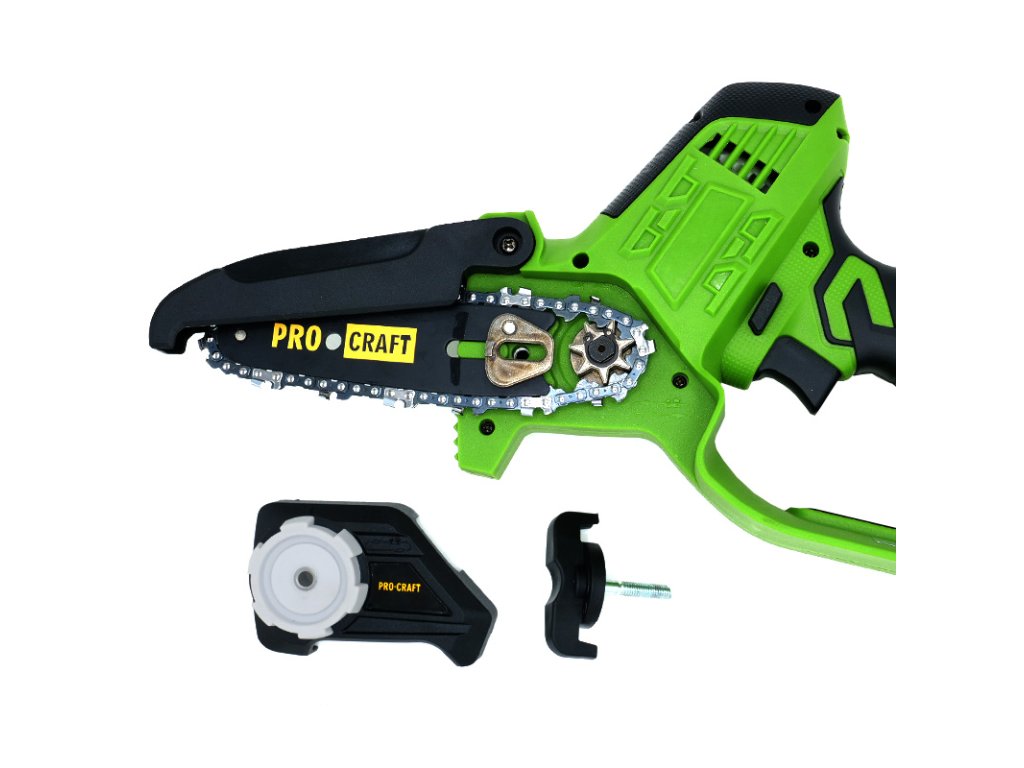 AKU jednoruční řetězová pila je díky svým kompaktím rozměrům užitečným pomocníkem při prořezávání stromů a keřů při práci v omezeném prostoru. Její provoz je v porovnání s většími stroji tichý. Je vybavena ochranou proti zpětnému rázu a bezpečnostním krytem pilového řetězu. Možnost řezání vysokých živých plotů nebo stromu pomocí přídavného prodlužovacího nástavce. Stroj je dodávaný včetně vodící lišty a pilového řetězu v kartonu s montážním klíčem a nádobou na mazací olej - bez akumulátoru a nabíječky.