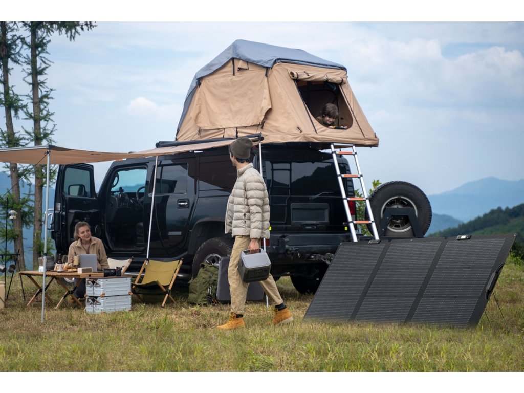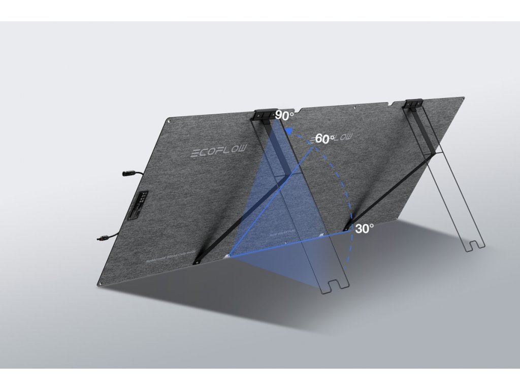 - Panel nabízí až 25% účinnost přeměny solární energie, vestavěný ukazatel úhlu dopadu slunečního světla a integrovaný stojan s nastavením sklonu 30–60°, což zajišťuje maximální efektivitu i během proměnlivých podmínek. Díky nízké hmotnosti a přepravnímu pouzdru je snadno přenosný a skladný.