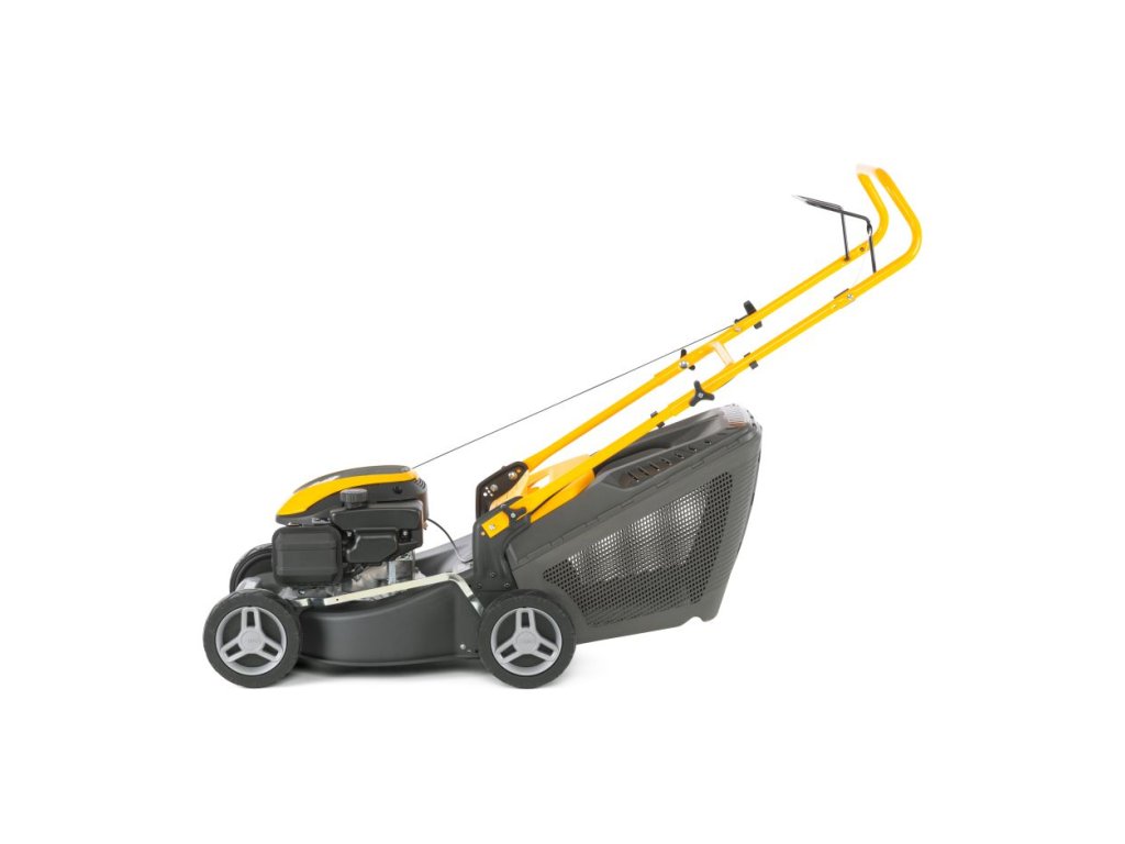 STIGA Collector 43 má šírku záberu 41 cm a je poháňaná spoľahlivým benzínovým motorom STIGA s objemom 123 cm3 a čistým výkonom 1,90 kW @ 2900 ot./min. Podvozok je vyrobený z ocele a systém nastavenia výšky kosenia je