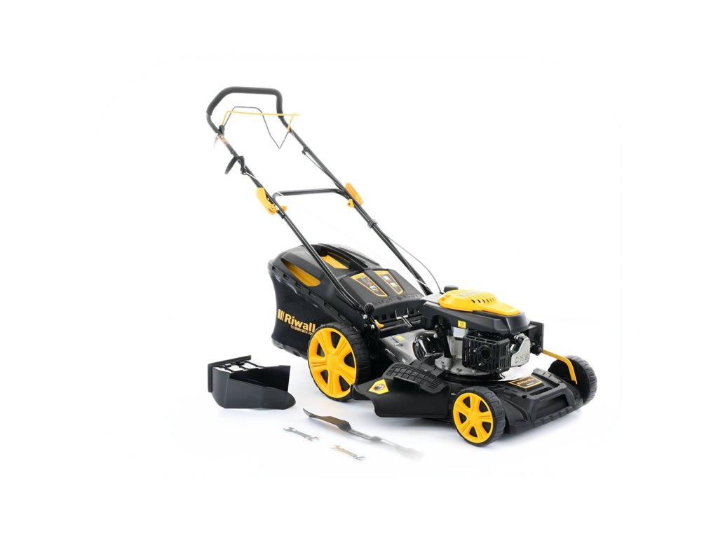 multifunkčna trávna kosačka 4 v 1 s benzínovým motorom a pojazdom Riwall PRO RPM 5135 + Olej pre 4 - taktné motory + Sada na výmenu oleja + Náhradný nôž