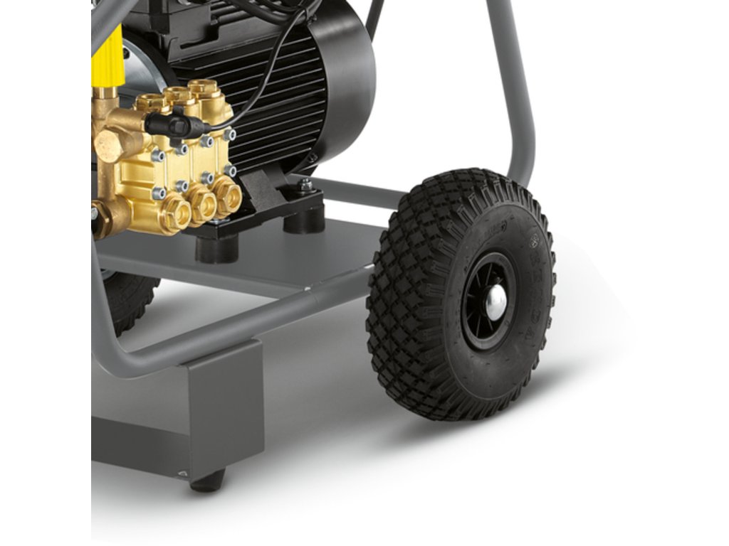 Či na veľkých staveniskách, pri zemných a výkopových prácach, v kameňolomoch alebo v poľnohospodárstve: Všade tam, kde je potrebné odstraňovať veľké znečistenie za náročných vonkajších podmienok, je ideálnou voľbou náš studenovodný vysokotlakový čistič s pohonom na trojfázový prúd HD 16/15-4 Cage Plus s vodným tlakom 150 bar. Vďaka vyzretej a vysoko kvalitnej technike čerpadla s kľukovým hriadeľom značky Kärcher ponúka tento stroj prietok vody až 1600 litrov za hodinu. Inovácie, ako je vysokotlaková pištoľ EASY!Force ako aj patentované rýchlouzávery EASY!Lock podporujú používateľa v oblasti pracovného komfortu a manipulácie. Zatiaľ čo vysokotlaková pištoľ EASY!Force využíva spätnú nárazovú silu vysokotlakového prúdu vody a znižujte tak silu potrebnú na udržanie stlačenej pištole na nulu, rýchlouzávery EASY!Lock umožňujú až 5-krát rýchlejšiu manipuláciu v porovnaní s bežnými závitovými spojmi bez negatívneho ovplyvnenia pevnosti a životnosti. Bezpečnostné pneumatiky zaručujú maximálnu mobilitu aj na neschodnom teréne.Dodatočné parametre