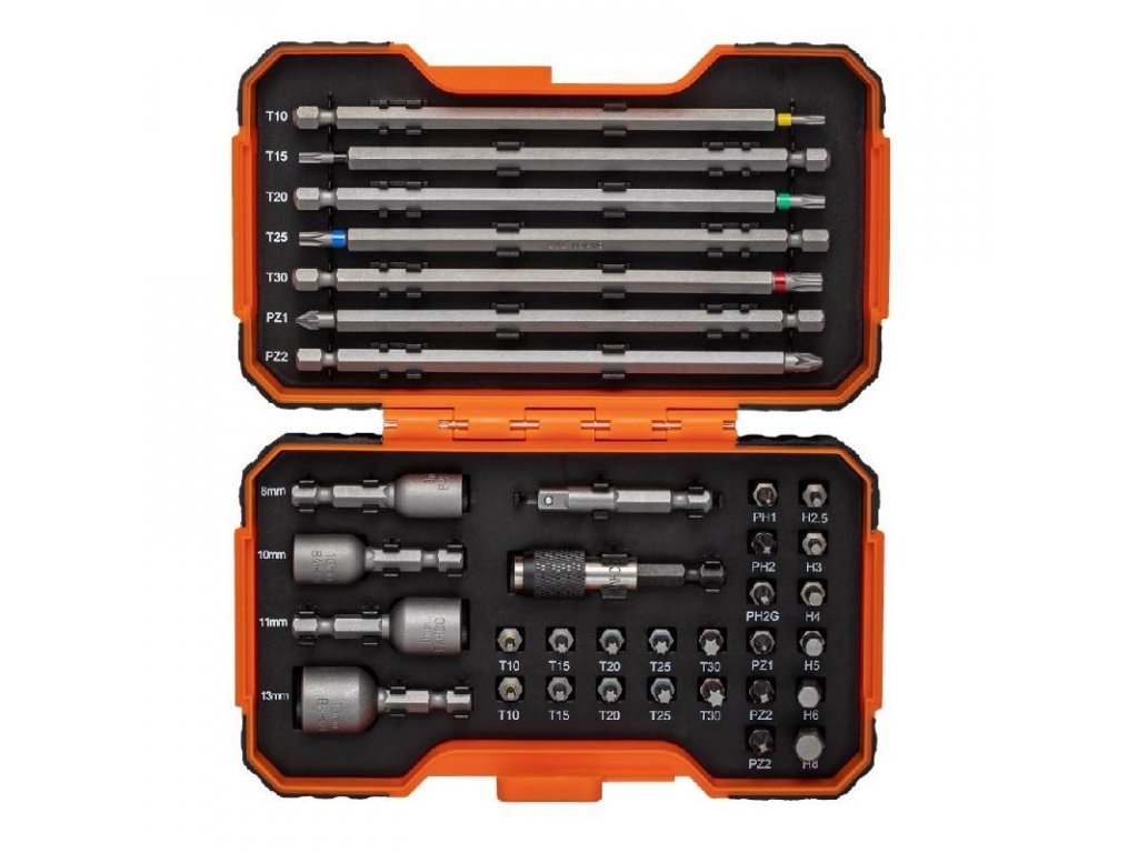 - Sada bitov - 35 kusov: 29 bitov, 4 výkonné nástrčné hlavy s magnetom, 1 magnetický držiak bitov a 1 adaptér