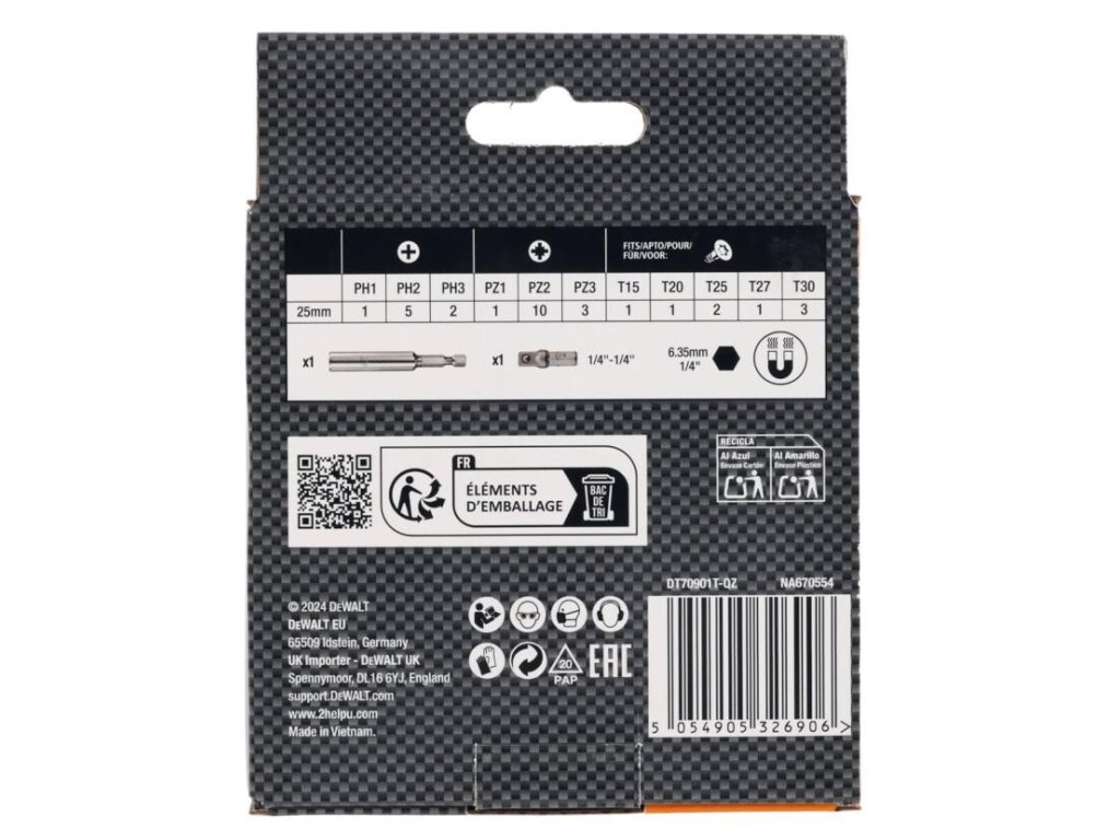 - Súprava obsahuje: 25 mm - PH1, 5x PH2, 2x PH3, PZ1, 10x PZ2, 3x PZ3, T15, T20, 2x T25, T27, 3x T30.