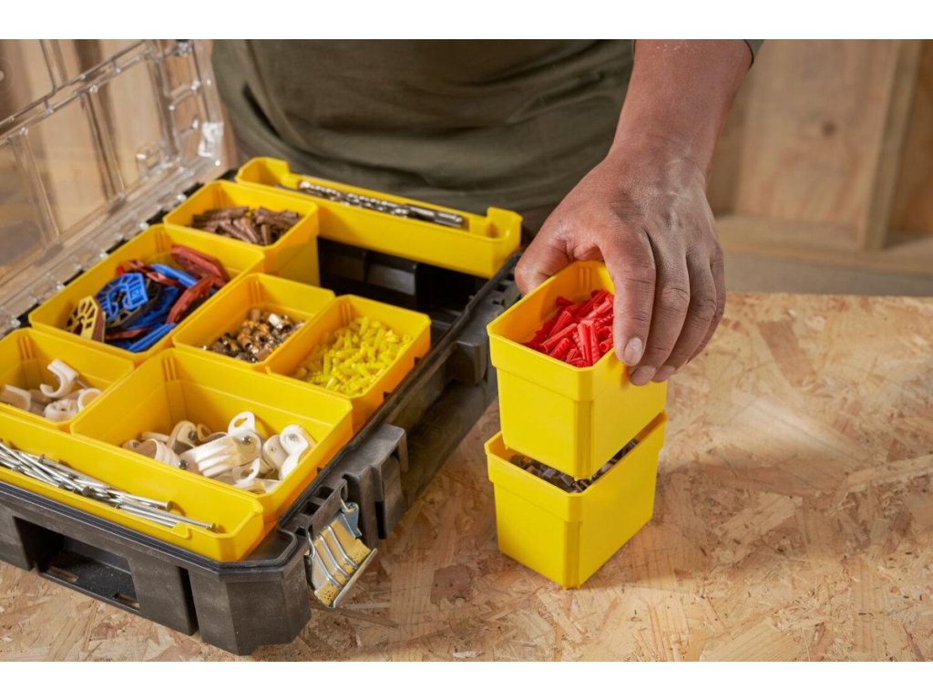 - Obsahuje 10 vyberateľných a stohovateľných misiek, ktoré je možné použiť interne v organizéri alebo priamo na pracovisku.