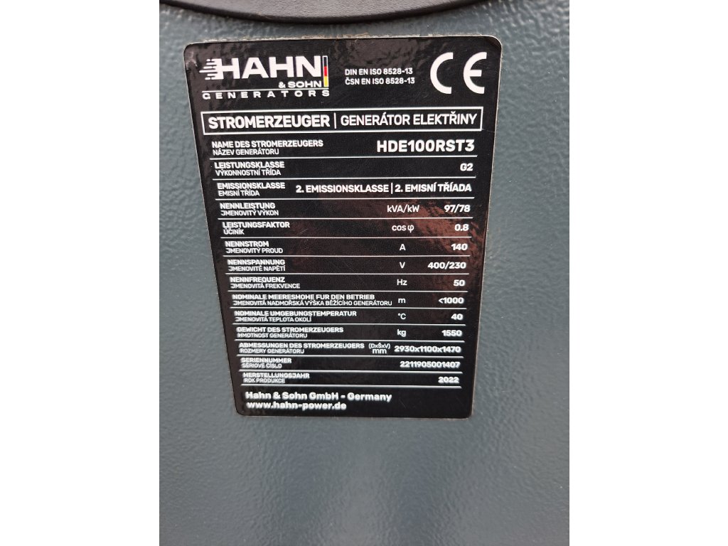 Elektrocentrála Hahn & Sohn HDE100RST3 je profesionální generátor s emisními certifikacemi.