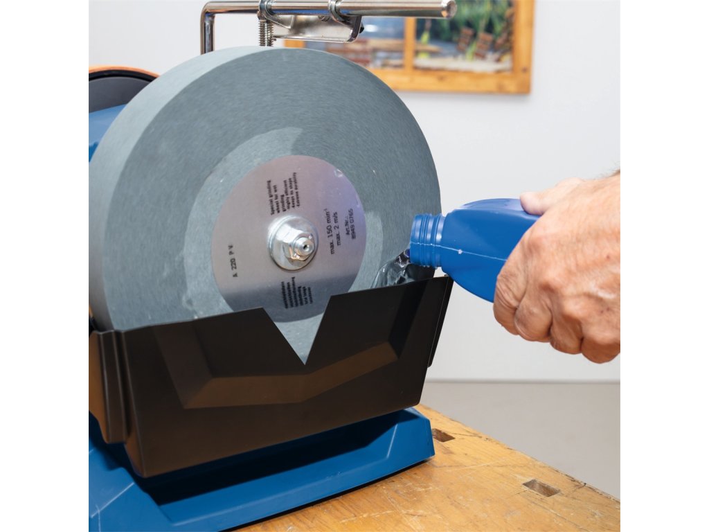 - ✅ Mokré Brúsenie: Kotúč sa točí v integrovanej nádobe s vodou, čo neustále chladí ostrie a zabraňuje jeho prehriatiu a strate tvrdosti (popúšťaniu).
