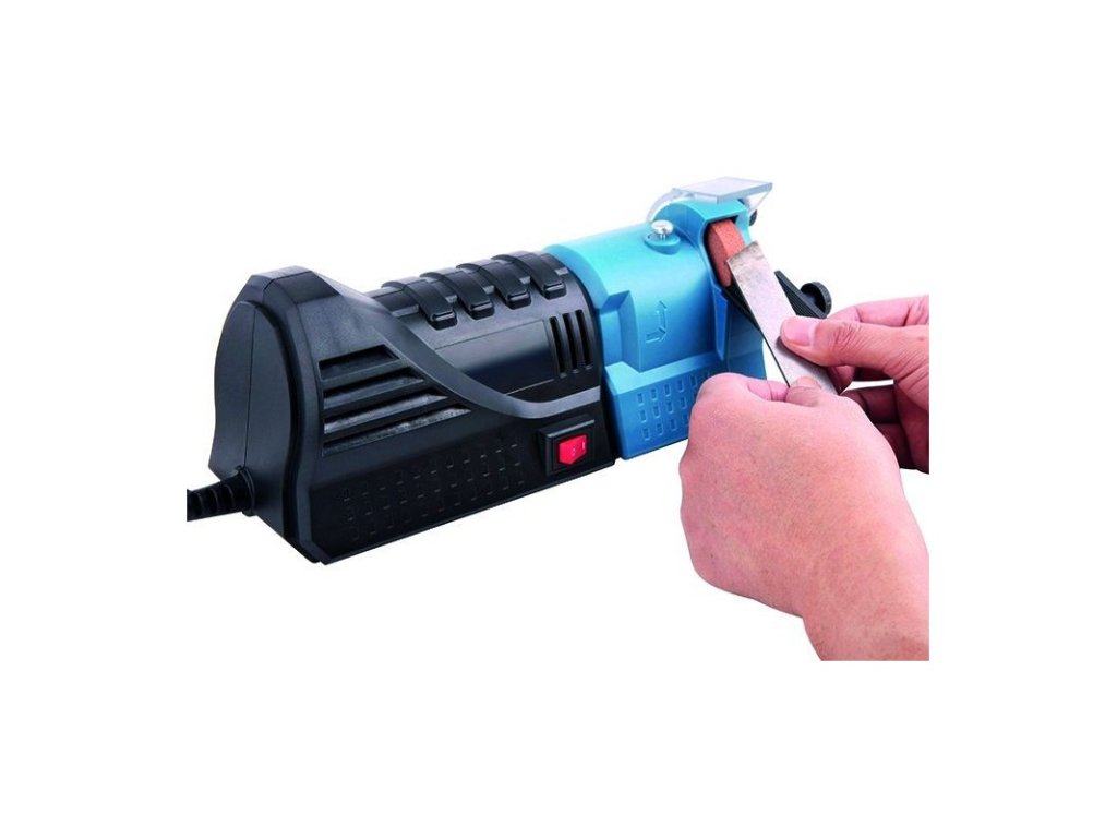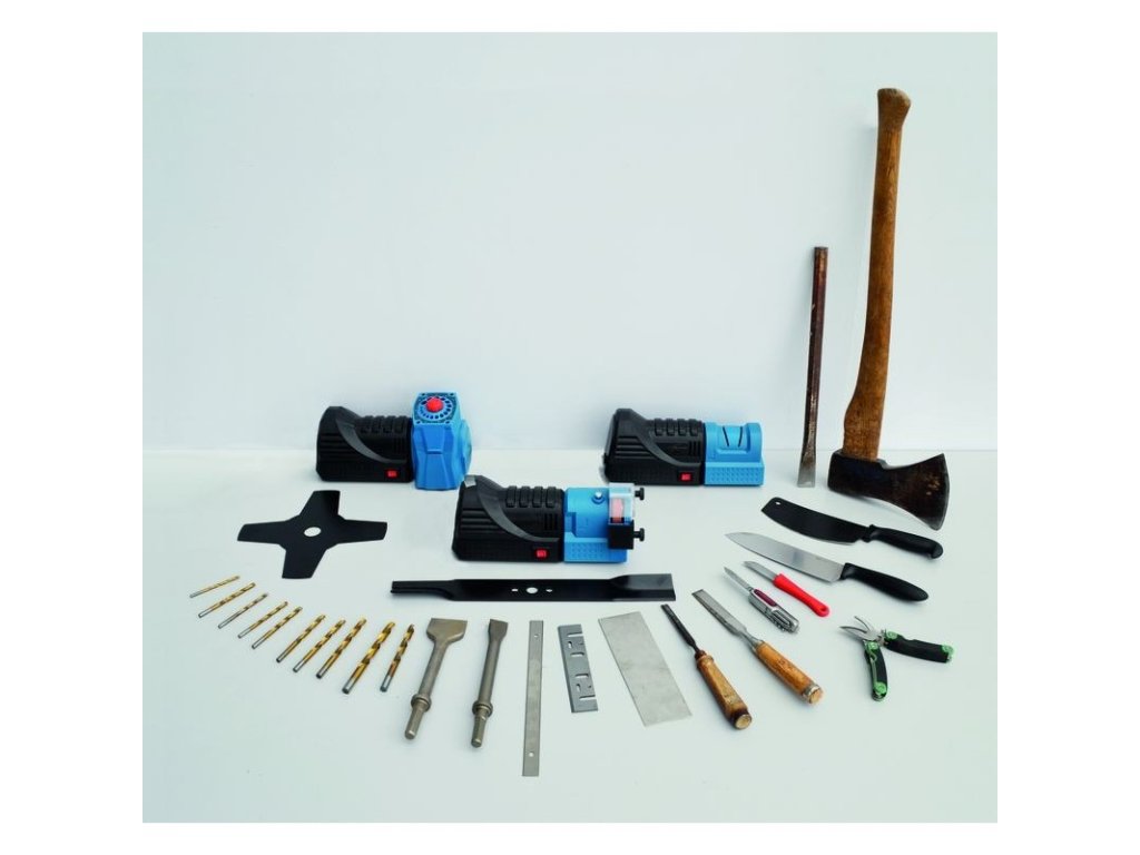 Univerzálna ostrička na brúsenie nožníc, vrtákov, nožov, dlát, sekier, skrutkovačov. Modul 1 - brúska / Modul 2 - ostrička nožov / Modul 3 - ostrička vrtákov (na vrtáky 3 - 10 mm).
