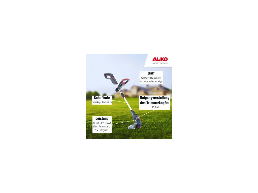 Akumulátorový vyžínač trávy AL-KO GT 1825 - 18 V BOSCH HOME AND GARDEN COMPATIBLE vrátane akumulátora a nabíjačky. Akumulátorový vyžínač presvedčí perfektnými výsledkami kosenia v osvedčenej kvalite AL-KO. Praktický záhradný vyžínač napájaný batériou vykonáva svoju prácu v domácej záhrade bez výfukových plynov a mimoriadne ticho. Nízka hmotnosť a praktické ovládanie s nastaviteľnou prídavnou rukoväťou a flexibilnou strihacou hlavou uľahčujú presné zastrihávanie vo všetkých polohách a v každom kúte záhrady. Technické údaje akumulátorového vyžínača trávy AL-KO GT 1825 S hmotnosťou len 2,4 kg vrátane batérie a ergonomicky nastaviteľnou prídavnou rukoväťou je tento vyžínač vysoko mobilným a ľahko použiteľným pomocníkom pre každého majiteľa záhrady. Flexibilná, otočná strunová hlava so šírkou záberu 25 cm a ochranou rastlín zabezpečuje presné zastrihávanie na okraji trávnika, pod kríkmi a na stenách. Vďaka automatickému mechanizmu môžete počas zastrihávania ľahko nastaviť optimálnu dĺžku struny poklepaním strunovej hlavy o zem. Výškovo nastaviteľnú hliníkovú teleskopickú hriadeľ si môžete individuálne nastaviť podľa svojej výšky. Sklopné koliesko na orezávanie okrajov vám pomôže čisto orezávať okraje. Vaša sloboda: Kompaktný akumulátorový vyžínač od spoločnosti AL-KO je ideálny pre začiatočníkov. Vďaka tichej prevádzke zostanú vaši susedia nerušení - môžete strihať kedykoľvek počas dňa, bez ohľadu na prísne stanovené časy odpočinku. S Li-Ion akumulátorom AL-KO 18 V BOSCH HOME AND GARDEN COMPATIBLE ( kompatibilné s 18 V BOSCH programom pre domácnosť a záhradu ) máte k dispozícii rôzne časy chodu a nabíjania, pretože si môžete vybrať zo štyroch rôznych veľkostí Ah. Môžete si vybrať medzi 2,5/4/5 a 6 Ah batériami. Prázdna batéria sa dobíja 60 až 130 minút. (V závislosti od kapacity batérie je čas nabíjania 60 až 130 minút. Na ešte rýchlejšie nabíjanie možno použiť aj rýchlonabíjačku batérií FC100 Li). Li-ion batéria je veľmi odolná, nenáročná na údržbu a ľahko a pohodlne sa nabíja bez samovybíjania alebo pamäťového efektu. Batéria (2,5 Ah) a nabíjačka sú súčasťou balenia. S radom akumulátorov AL-KO 18 V Bosch Home & Garden Compatible ste vďaka nášmu početnému záhradnému náradiu dokonale vybavení na každé použitie. Okrem toho sú batérie a nabíjačky kompatibilné so všetkými nástrojmi rôznych výrobcov, ktoré pracujú s 18 V batériovým systémom Bosch Home and Garden. Kúpte si akumulátorový vyžínač trávy AL-KO GT 1825 Akumulátorovú kosačku AL-KO GT 1825 si môžete kúpiť v našom internetovom obchode alebo u niektorého z našich špecializovaných predajcov. Je to ideálny výrobok, ak hľadáte ľahký a praktický akumulátorový zastrihávač.18 V lítium-iónová batéria. Batéria a nabíjačka sú súčasťou baleniaPraktický indikátor nabitia batérie v rukovätiUhlovo nastaviteľná rukoväť a teleskopická tyč na individuálne nastavenieS nastavením sklonu strunovej hlavy o 180 stupňovSklápacia ochrana rastlínVysokokvalitná nylonová struna s automatickým mechanizmomNáhradná cievka so strunou je súčasťou baleniaDodatočné parametre