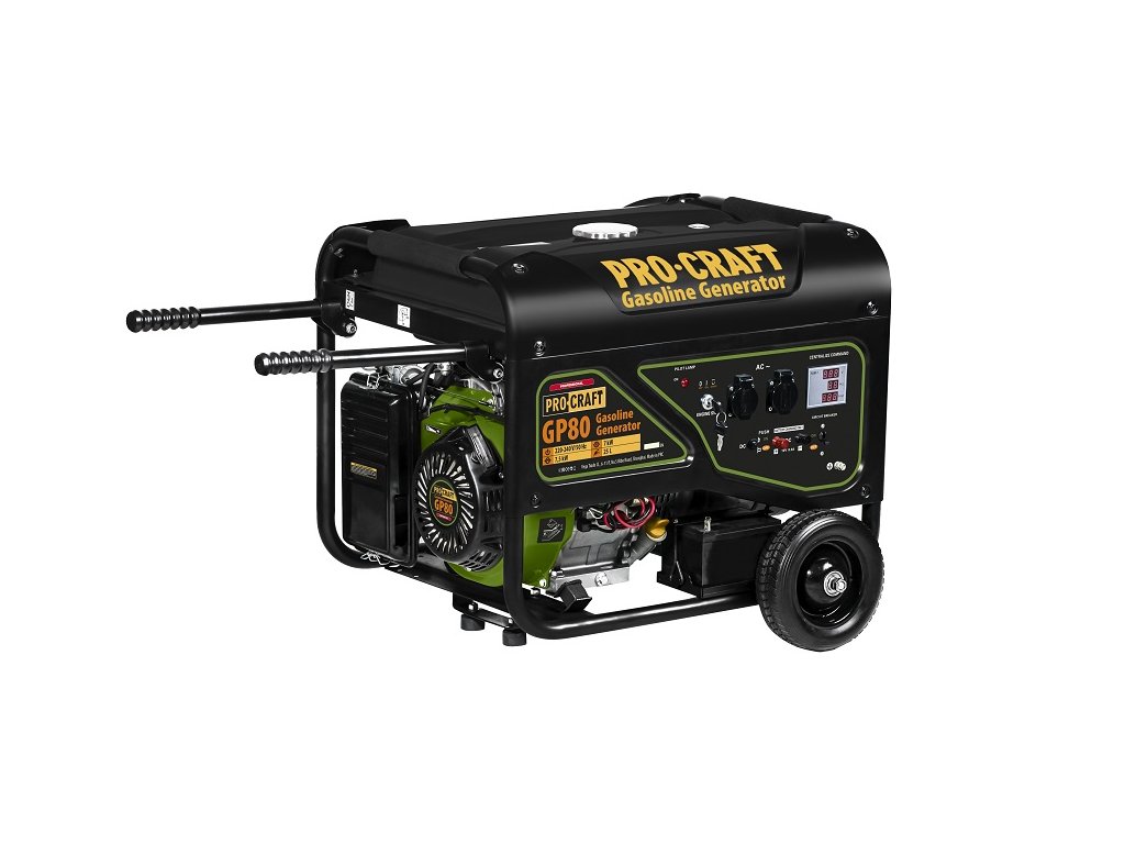 Elektrocentrála Procraft GP80 je určena k použití jako nezávislý generátor elektrického proudu při výpadcích elektřiny, jako zdroj energie při stavebnictví, v domácnosti, kde není elektrická síť dostupná. Díky vysokému výkonu umožňuje napájení nejen domácích spotřebičů, ale i spotřebičů indukčního typu. Elektrocentrála má palivovou nádrž o objemu 25l, čím zaručí dlouhý nepřetržitý provoz. Elektronický start zajišťuje rychlé spuštění benzinového motoru. Robustní ochranný rám umožňuje použití elektrocentrály v jakýkoliv podmínkách a taky usnadňuje transportování. Součástí dodávky jsou elektrická zástrčka, 2 rukojeti, 2 kola, klíč na svíčku. Balení karton. Přepětová ochrana AVR.