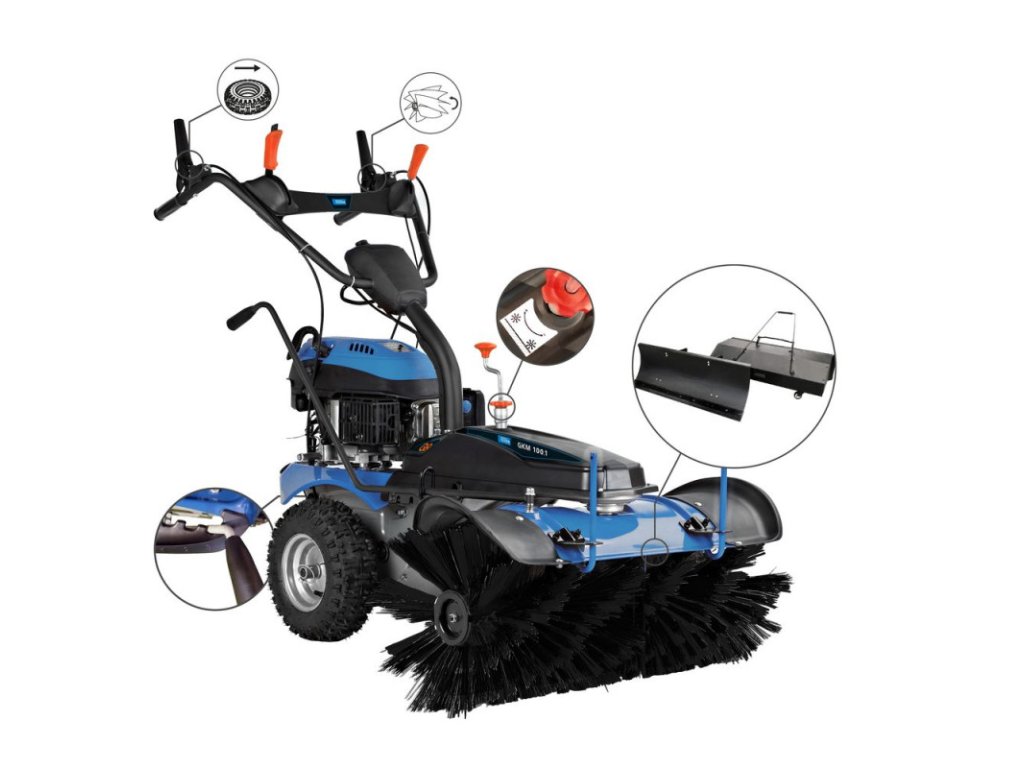Zametací stroj GKM 100.1 je všestranne použiteľný a ideálny na najrôznejšie práce. Poradí si s ľadom, snehom, lístím aj každodennými nečistotami. Dá sa jednoducho prestaviť iba v niekoľkých krokoch. Stroj je vybavený veľkou zbernou nádobou s kapacitou 72 litrov, a tak zaisťuje dlhé pracovné intervaly bez častého vyprázdňovania. Nízka hlučnosť v kombinácii s vyšším krútiacim momentom a zníženými vibráciami výrazne zvyšuje komfort pri práci. Súčasťou balenia je okrem motorovej metly aj odhŕňač snehu a zberná nádoba. Výškovo a smerovo nastaviteľná zametacia kefa, ako aj štartovacie lanko s funkciou jednoduchého štartu zaisťujú nekomplikovanú obsluhu. Nezávisle nastaviteľné otáčky kefy. Nastaviteľná rukoväť a rozsiahle možnosti prevodových stupňov poskytujú flexibilitu v rôznych pracovných podmienkach. Tento zametací stroj je možné optimálne prispôsobiť príslušnému zámeru čistenia vďaka nezávislému nastaveniu rýchlosti kefy. Ďalšou výhodou je, že sa dodáva čiastočne zmontovaný, takže uvedenie do prevádzky prebieha hladko a s úsporou času.