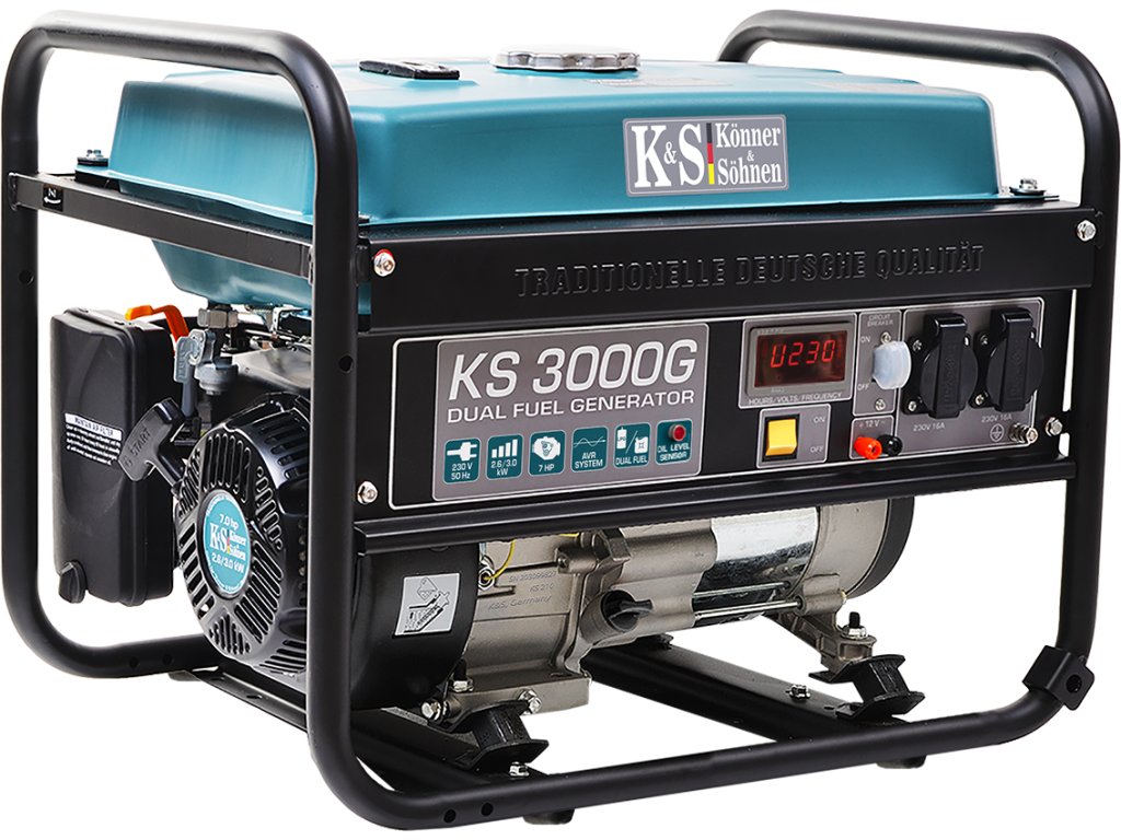 Elektrocentrála KS 3000 G řady DUAL FUEL pracuje jak na benzín, tak na zkapalněný plyn (propan-butan). Díky své účinnosti je tak šetrná k životnímu prostředí a pohon na plyn zvyšuje životnost motoru. Výkonný jednoválcový vzduchem chlazený čtyřtaktní motor K&S zajišťuje stabilní a spolehlivý provoz elektrocentrály.