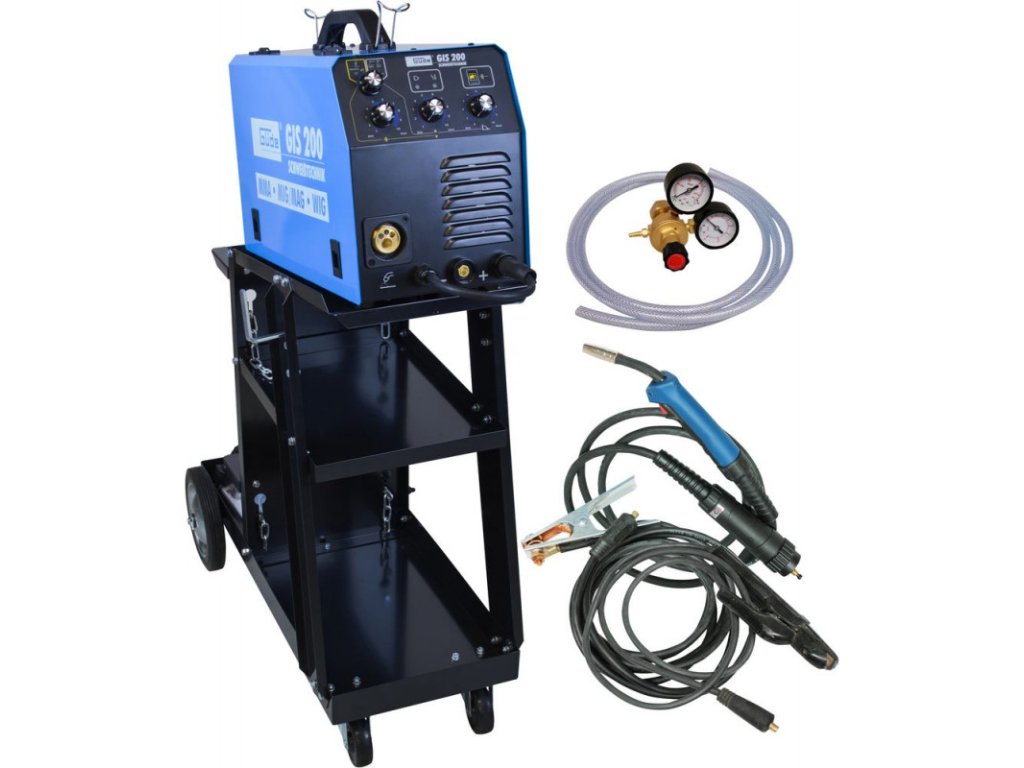 Univerzálny invertorový zvárací prístroj s maximálnym zváracím prúdom 200 A, s ktorým sú možné prakticky všetky štyri možnosti zvárania: MIG/MAG, MMA (zváranie elektródou), Flux (zváranie plneným drôtom) aj zváranie metódou WIG (voliteľné) s voliteľným WIG horákom (kód tovaru: 41690). Tento zvárací prístroj je vhodný na príležitostné, krátkodobé použitie pri zváraní malého až stredne veľkého rozsahu pre domácich majstrov a na poloprofesionálne využitie. Špičkové funkcie ako ARC-FORCE (pre automatické riadenie dynamiky a stabilizáciu elektrického oblúka, ako aj dokonalé výsledky zvárania), ANTI STICK (pre zabránenie nepríjemnému prilepeniu elektródy k obrobku) a HOT START (pre optimálne správanie elektródy pri zapaľovaní) zabezpečujú skvelé výsledky zvárania aj pri náročných požiadavkách. Profesionálne vybavenie dopĺňajú ďalšie možnosti nastavenia ako 2-taktné alebo 4-taktné zváranie (plynulý posuv drôtu), ako aj tlačidlo ručného posuvu na vkladanie zváracieho drôtu. Vhodné pre malé cievky a plastové cievky D200 (5 kg). Kryt vyrobený z oceľového plechu s povrchovou úpravou práškovou farbou. Tepelná ochrana proti preťaženiu. Dvojhodinový redukčný ventil, 2-metrová hadica na plyn. Držiak elektród a ukostrovacia svorka, kladivo na trosku s kefou pre MMA procesy. MIG/MAG horák, regulátor tlaku pre ochranný plyn. Trojmetrový zväzok hadíc (kompatibilný MB15), 2,5-metrový uzemňovací kábel s ukostrovacou svorkou, 3 elektrické trysky (0,6/0,8/1,0 mm), 1 plynová tryska. Vrátane stabilného zváracieho vozíka (na plynové fľaše 5/11/20 kg).Sieťové napätie: 230 VFrekvencia: 50 HzSpôsob ochrany: IP21SIzolačná trieda: HVýkon pri chode naprázdno: 9 W (230 V) / 17 W (400 V)Maximálny výkon siete 230 V: 5 kVAIstenie siete: 16 ANapätie pri chode naprázdno: 10,4 – 26 VMaximálny zvárací prúd v sieti 230 V: 200 ARozsah regulácie zváracieho prúdu: 10 – 200 AOdporúčaná hrúbka materiálu: 0,8 – 15 mmHrúbka drôtu (nehrdzavejúca oceľ): 0,8 mmMMAHrúbka elektród: 1,6 – 4,0 mmDoba zapnutia pri maximálnom prúde v sieti s 230 V: 180 A~20 % / 120 A~60 % / 100 A~100 %ANTI STICK / ARC FORCE / HOT STARTMIG / MAGMaximálny zvárací prúd 230 V: 190 ARozsah regulácie zváracieho prúdu: 10 – 190 ADoba zapnutia pri maximálnom prúde v sieti s 230 V: 190 A~20 % / 120 A~60 % / 100 A~100 %WIGDoba zapnutia pri maximálnom prúde v sieti s 230 V: 200 A~20 % / 120 A~60 % / 100 A~100 %Dĺžka hadicového zväzku: 3 mRozmery (DxŠxV): 820 x 400 x 1035 mmHmotnosť netto/brutto: 33,5 kg/38,7 kgDodatočné parametre