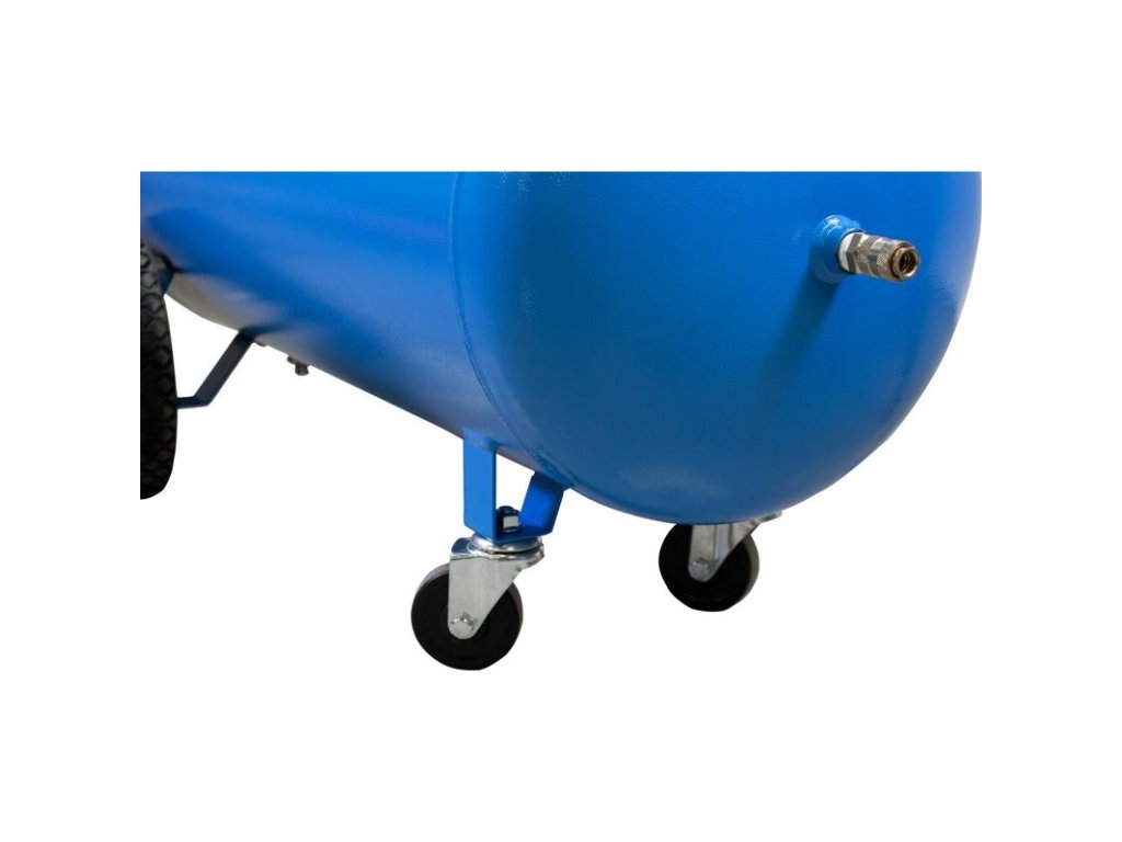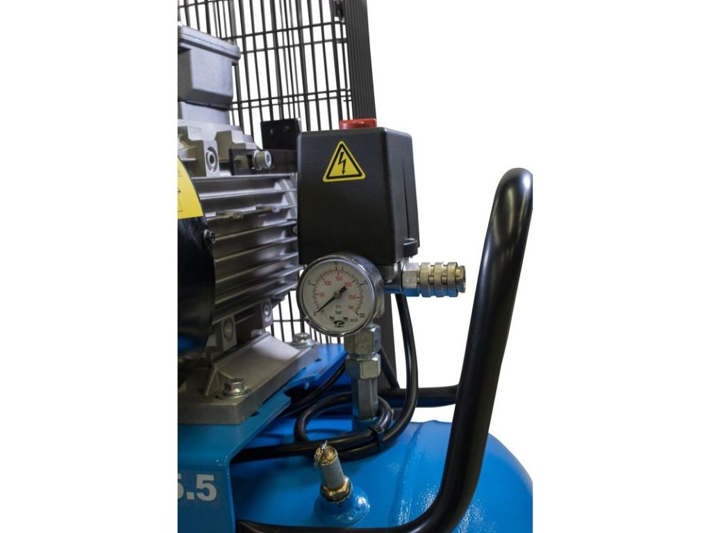 Dvojstupňový dvojvalcový kompresor s olejovým mazaním, s remeňovým pohonom. Tlakový spínač Condor, manometer tlaku v nádobe a manometer pracovného tlaku, redukčný ventil a odlučovač vody, 3 spojky na stlačený vzduch, 3 dochladzovače, spätný ventil, vypúšťací ventil na kondenzát. Bezpečnostný ventil, vzduchový filter, ochrana proti preťaženiu. Dve otočné kolieska, plastové kolesá, prepravná rukoväť.