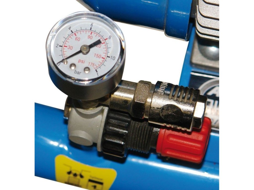 Bezolejový 2-valcový piestový kompresor s priamym pohonom, rukoväť, odolný pomalý chod, o 20% tichší ako iné kompresory, manometer tlaku v kotle a pracovného tlaku. Redukcia tlaku, 1 spojka stlačeného vzduchu, poistný ventil a skrutka na vypúšťanie kondenzátu. Vzduchový filter. Originálny tlakový spínač Condor. Ventily z nehrdzavejúcej ocele.