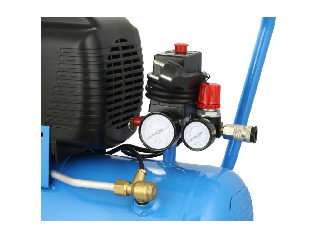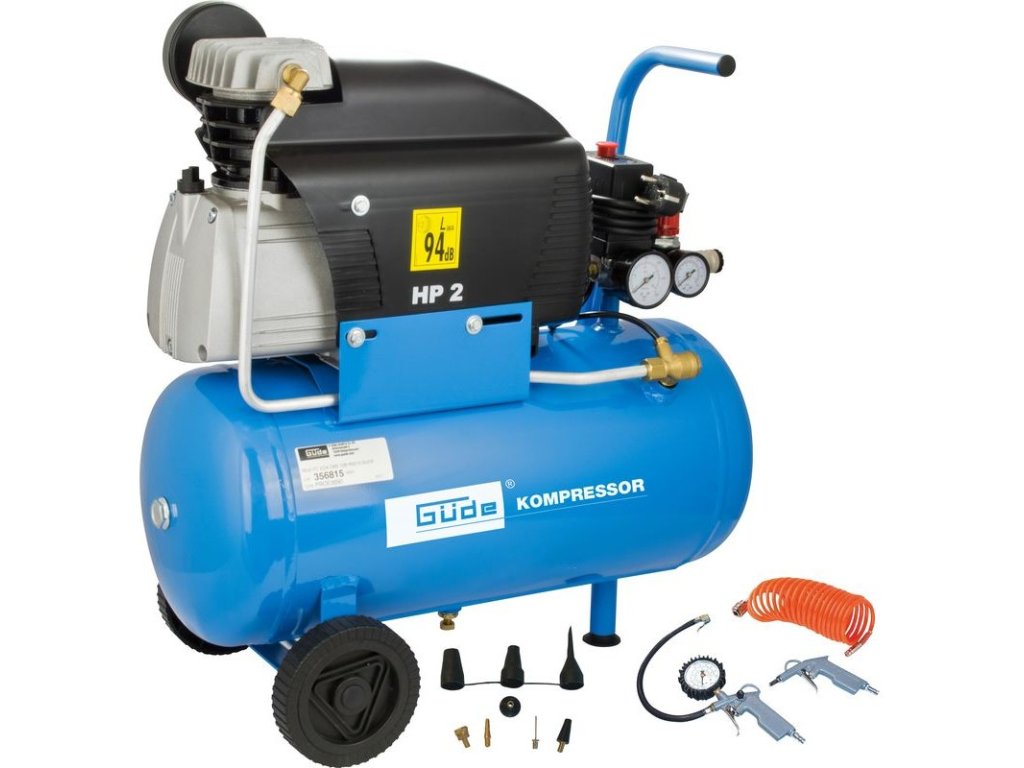 Jednovalcový kompresor s olejovým mazaním, s priamym pohonom. Tlakový spínač, manometer tlaku v nádobe a manometer pracovného tlaku, 1 spojka na stlačený vzduch, redukčný ventil pracovného tlaku, poistný ventil, bezpečnostný ventil, spätný ventil, vypúšťací ventil na kondenzát. Vzduchový filter. Noha s gumovým nárazníkom, plastové kolesá, prepravná rukoväť. Sada náradia na stlačený vzduch obsahuje 5 m PU hadicu špirálovú so spojkou, fúkaciu pištoľ, hustilku pneumatík, 3 ks plastových adaptérov, 5 ks mosadzných adaptérov.Sieťové pripojenie: 230 VFrekvencia: 50 HzDruh ochrany: IP 22Výkon motora (P1): 1,5 kWPrevádzkový režim: S3 /50%Otáčky motora: 2850 min-1Maximálny sací výkon: 206 l/min.Skutočné dodávané množstvo pri 0 bar: 140 l/min.Skutočné dodávané množstvo pri 4 bar: 100 l/min.Skutočné dodávané množstvo pri 7 bar: 77 l/min.Maximálny tlak: 10 barObjem nádoby: 24 lHladina akustického výkonu LWA: 94 dBRozmery (DxŠxV): 550 x 280 x 597 mmHmotnosť netto/brutto: 21,3 kg/22,9 kgDodatočné parametre