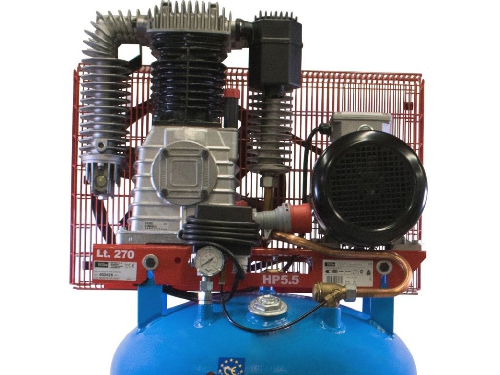 Vertikálny priemyselný kompresor vhodný na pripojenie k existujúcemu potrubnému napájaciemu systému. Dvojstupňový dvojvalcový agregát s olejovým mazaním, s remeňovým pohonom cez veľké remenice. Tlakový spínač Condor s ochranou motora, manometer tlaku v nádobe. Spojka na stlačený vzduch s pákovým ventilom, 2 medzichladiče, 1 dochladzovač, poistný ventil, vypúšťací ventil na kondenzát, bezpečnostný ventil, veľký vzduchový filter. Tri nohy, tri gumové tlmiče vibrácií na nohy.