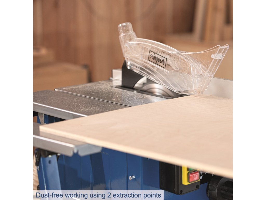 Integrované bočné predĺženie stola z hliníkovej zliatiny umožňuje bezpečnú prácu s rozmernejším materiálom.
