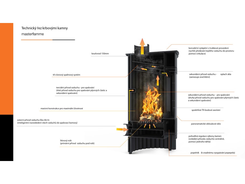 horná platňa môže slúžiť pro rychlý ohřev jídel. Fénový efekt - teplo do několika minut krbová kamna Masterflamme lze použít při vytápění obytných a rekreačních objektů. Díky rychlé vytápěcí schopnosti a velikosti spalovací komory jsou také velice oblíbená ve výrobních dílnách, skladech a jiných průmyslových prostorech. Krbové kachle Masterflamme maji díky své unikátní konstrukci jedinečnou schopnost rychlé tvorby tepla a jeho plynulou a rovnoměrnou distribuci. Studený vzduch je vespodu nasáván do trubek které tvoří přímo spalovací komoru. Tím dochází k bezprostřednímu ohřevu vzduchu a jeho vyfukování zpět do místnosti. Díky tomuto “Fénovému efektu” umí kamna Masterflamme během velice krátké doby předat velké množství tepla a rovnoměrně ho distribuovat do vytápěných prostor. Eko-Air-In zajištuje centrální přísun vzduchů pomocí externího nasávání ze zadní části kamen. Kompletní spalovací proces je řízen pouze jedním ovládacím prvkem v pravém dolním rohu krbových kamen. Systém Eko-Air-In stejně tak zaisťuje bezpečnosť pred výbuchom plynných častí pomocí plynulého přisávání čerstvého vzduchu. Tento inovativní prvek zajišťuje vysokú účinnosť, zníženie spotreby paliva až o 40% a zejména šetrnosť k životnému prostrediu. Množstvo popola je minimálne. Krbové kachle Masterflamme splňují nejpřísnější evropské CE normy (EN 13240, BlmSchV - Stufe 2, 15a B-VG, DINplus)