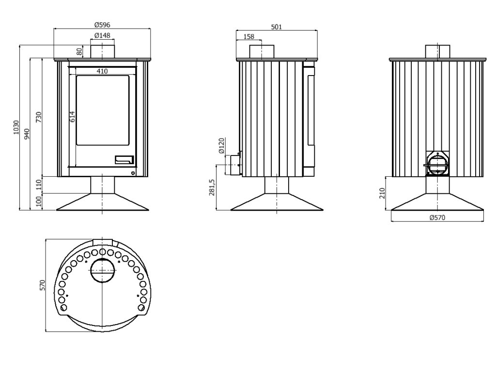 v spodnej časti nasávajú rúrky studený vzduch, který se průchodem pláště velmi rychle ohřívá a je vyfukován do místnosti.