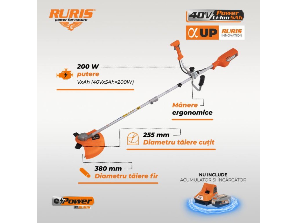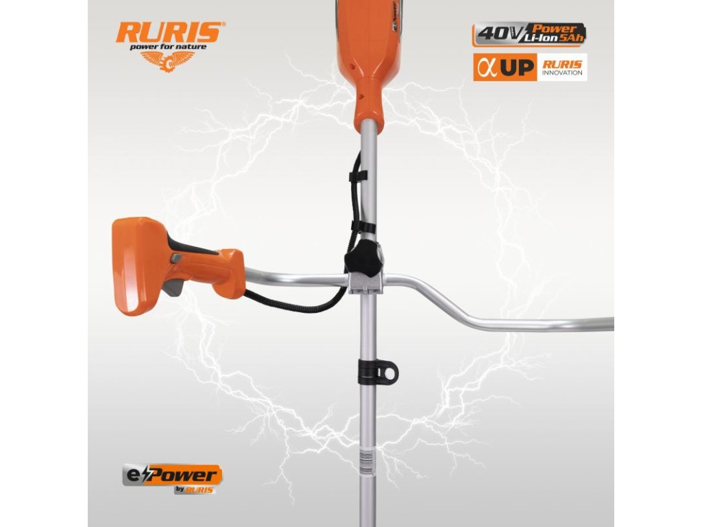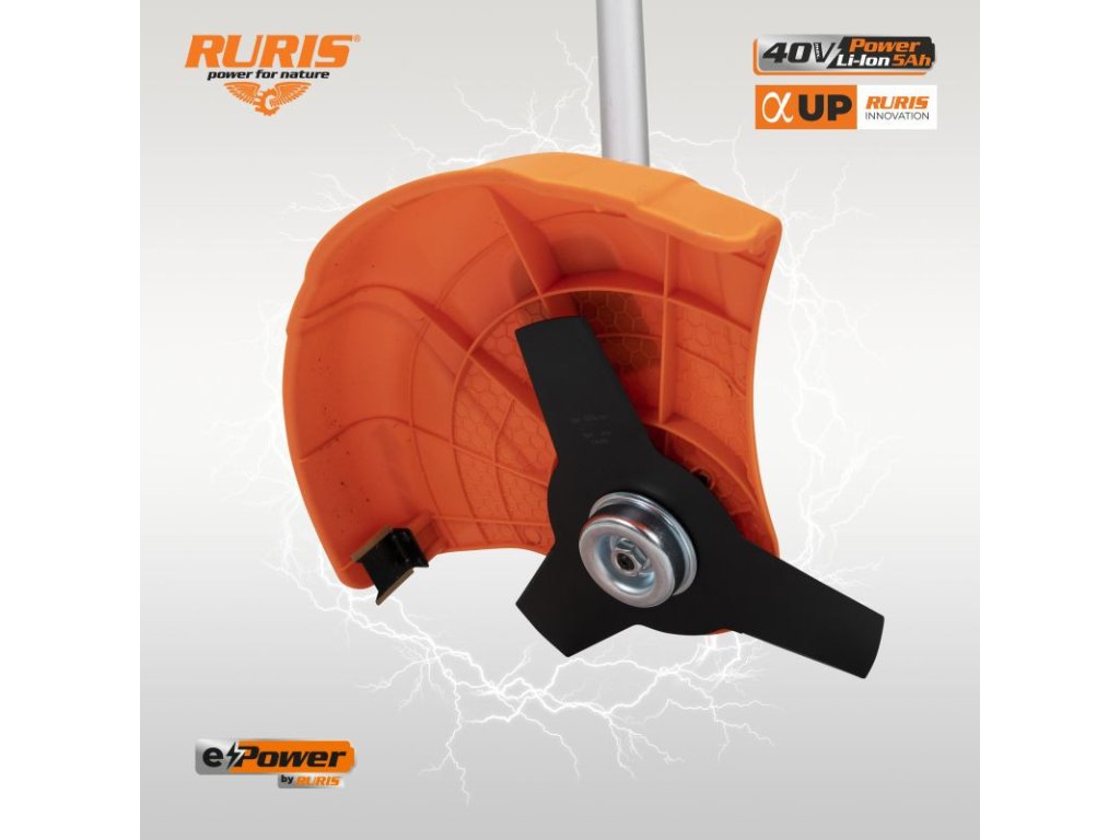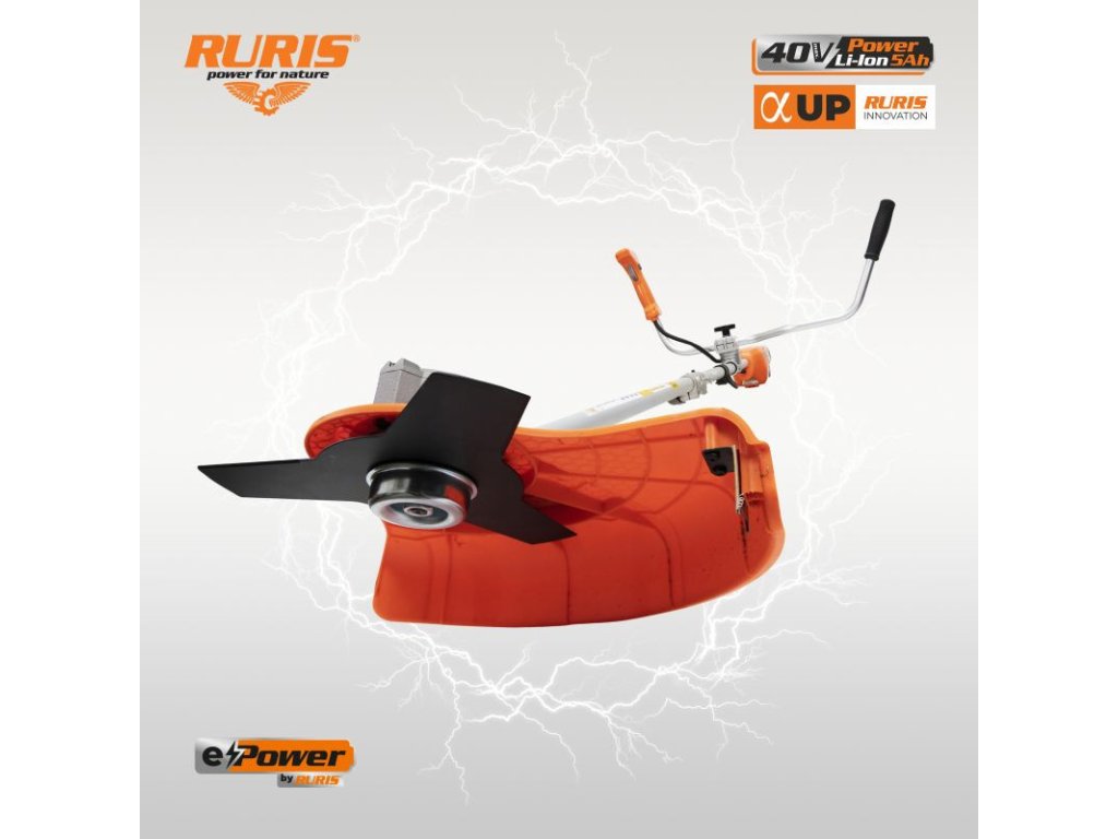 RURIS RR3845e je záhradnícke náradie poháňané 40V 5Ah Li-Ion batériou. Výhodou tohto náradia je, že je tichší a ľahšie sa s ním manipuluje ako s kosačkami so spaľovacím motorom, pretože nepotrebuje žiadne palivo a nevypúšťa žiadne výfukové plyny. Okrem týchto výhod ponúkajú krovinorezy na batérie aj väčšiu voľnosť pohybu, pretože nie sú závislé od elektrického kábla.