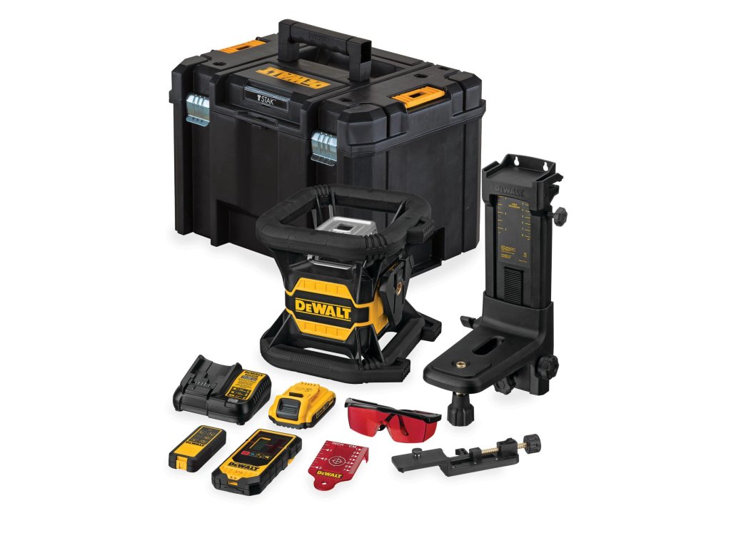 • Balenie obsahuje: Kufor TSTAK, prichytenie na stenu alebo profil, akumulátor XR 18 V/2,0 Ah, nabíjačku, detekčné okuliare a kartu, diaľkové ovládanie a detektor lúča