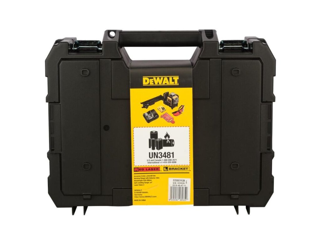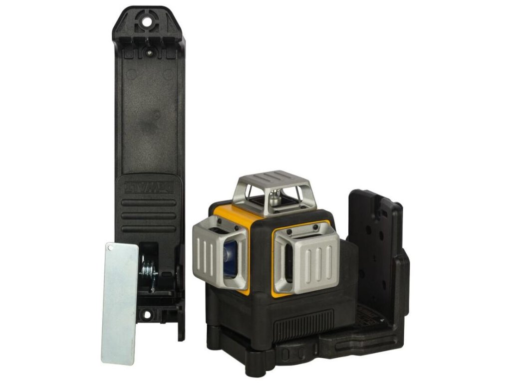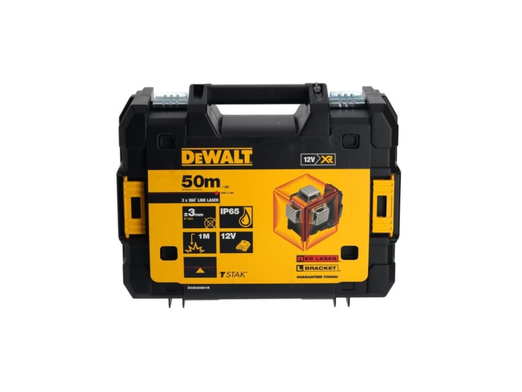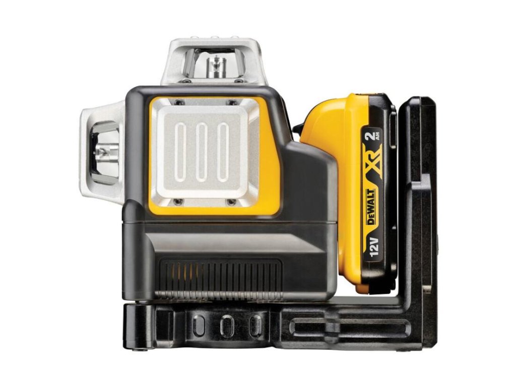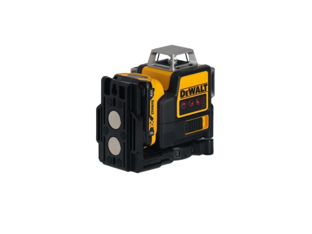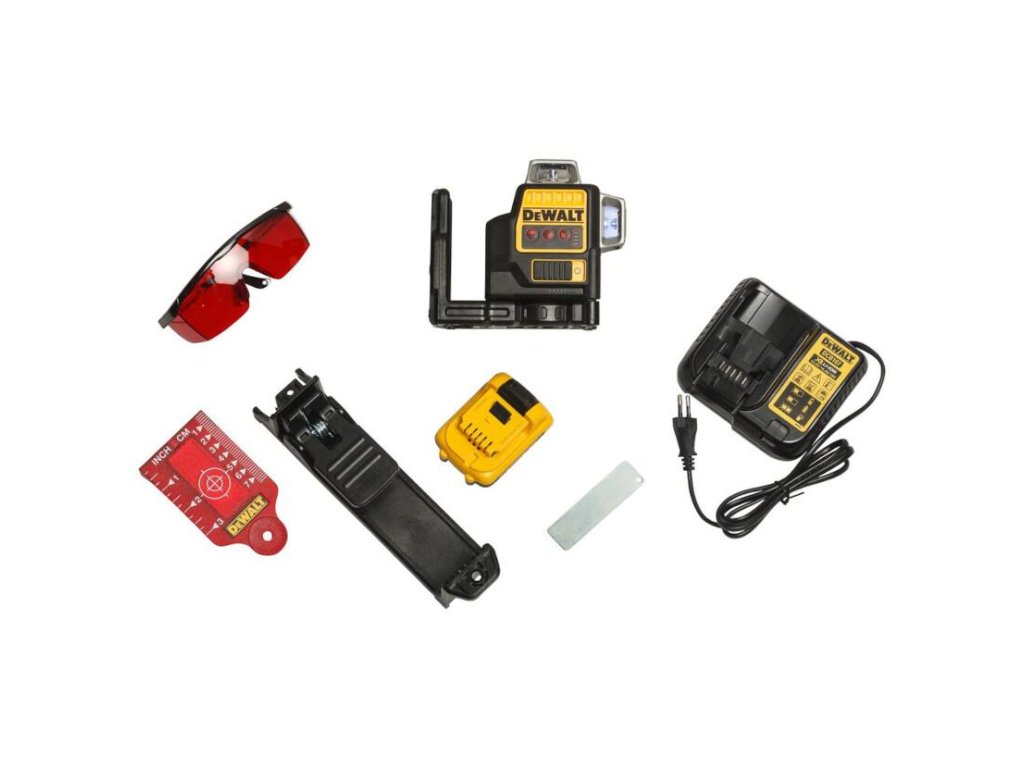 - Krížový laser s automatickým vyrovnaním 3× 360° napájaný DeWALT akumulátorom 10,8 V.