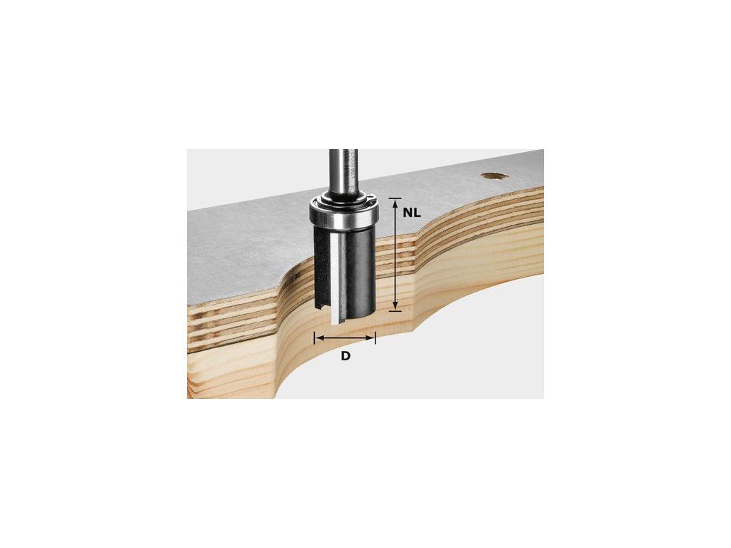 Valcovitá fréza na frézovanie pomocou šablón. Vďaka guľôčkovému ložisku v hornej časti leží šablóna na obrobku a chráni ho pred poškodením počas opracovávania.