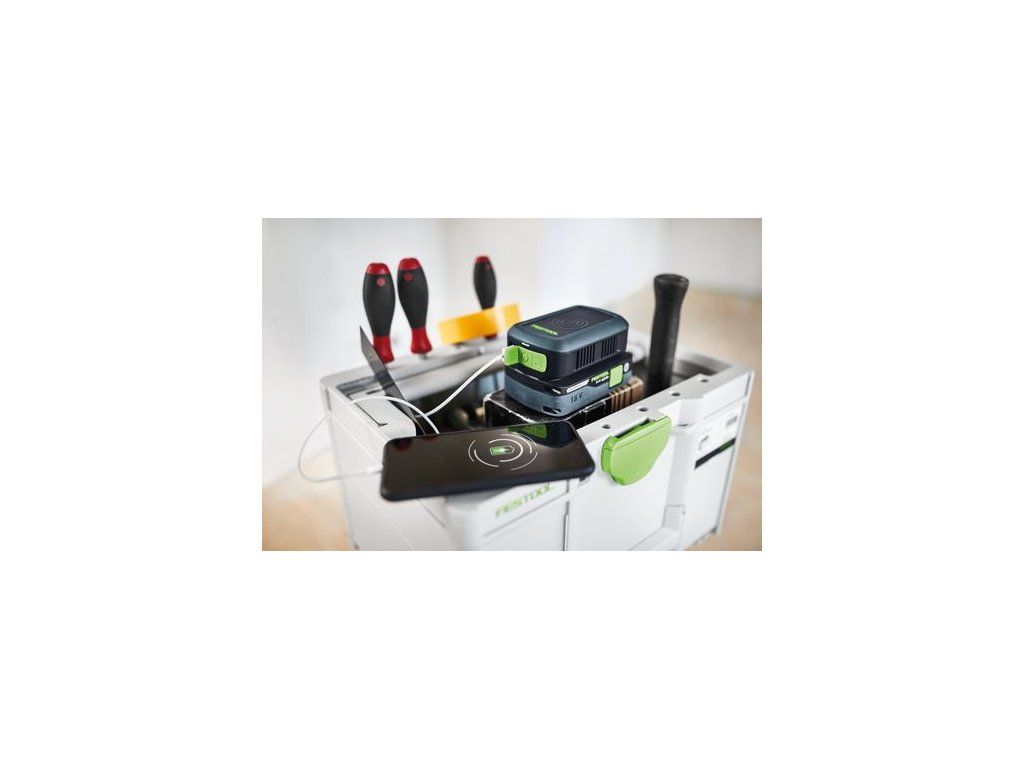 - Zbavuje závislosti: V kombinácii s nabitým akumulátorom Festool 18 V nabije mobilný telefón aj vtedy, keď v blízkosti nie je zásuvka