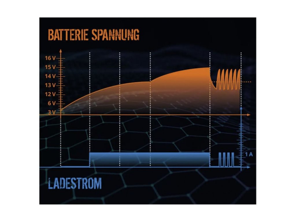 Invertorová technológia pre efektívne využitie energie, procesorom riadená technológia inteligentného nabíjania, 6-stupňové plnoautomatické nabíjanie šetriace batériu. Pre všetky bežné typy batérií 6 a 12 V. Permanentné udržiavacie nabíjanie, možné priame nabíjanie batérie pripojenej vo vozidle. Ochrana proti prepólovaniu a skratu. Špeciálny obnovovací režim, obzvlášť pre hĺbkovo vybité batérie. Plne izolované svorky batérie, s praktickým uškom na zavesenie.Typy nabíjateľných batérií: PB (olovená batéria aj bezúdržbová) GEL (gélová batéria)AGM (batéria s elektrolytom nasiaknutým do netkanej textílie zo skleného vlákna)WET (batéria s tekutým elektrolytom)Sieťové napätie: 230 VFrekvencia: 50 HzVýstupné napätie: 6 / 12 VEfektívny nabíjací prúd: 1 AKapacita batérie: 4 - 30 AhHmotnosť netto/brutto: 0,33 kg/0,41 kgDodatočné parametre