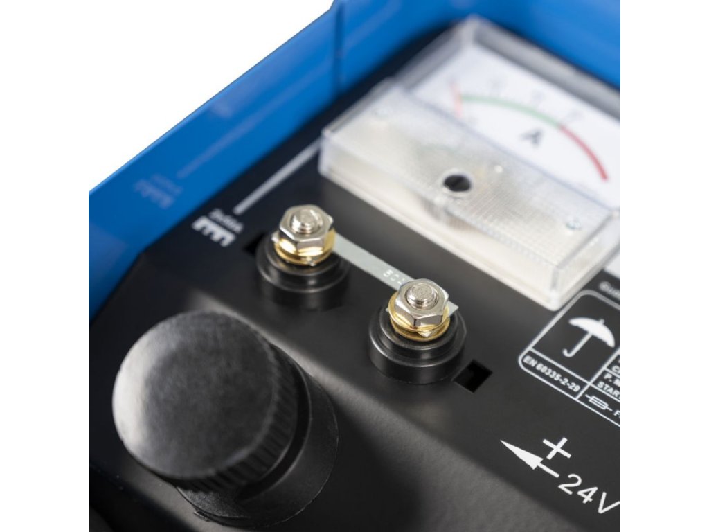 Nabíjačka autobatérií na nabíjanie, rýchle nabíjanie a štartovanie vozidiel. Vhodná pre 12 V a 24 V batérie, bezšumový analógový ampérový displej, vrátane 10 poistiek (50 A). Tepelná ochrana a ochrana proti prepólovaniu, plne izolované svorky batérie. Prípojný kábel 2 m, jednoduché presúvanie vďaka 2 kolesám. Typy batérií: PB - olovená batéria (aj MF), WET - mokrá batéria.