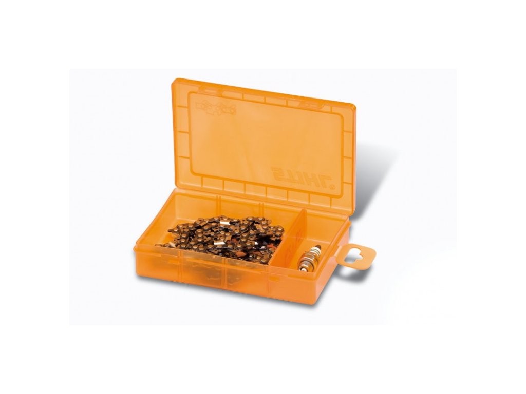 Robustný, ľahký plastový box s dvoma oddelenými časťami. Pre uloženie rezných reťazí. Rozmery: 18x12x4 cm.