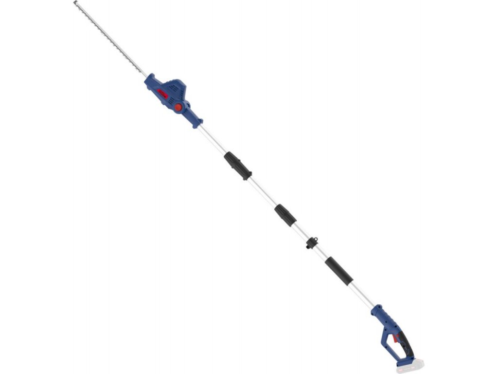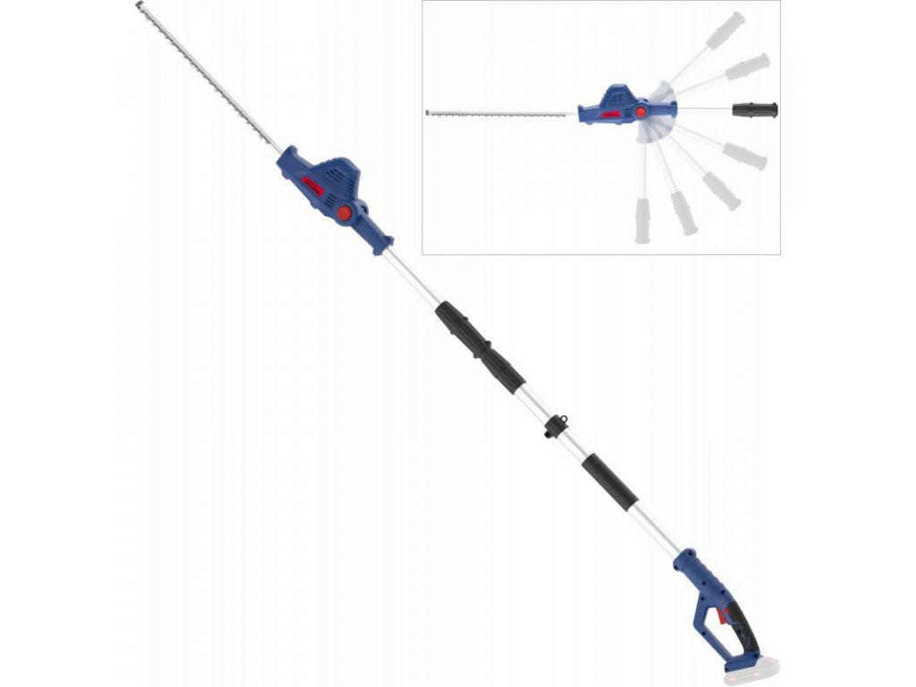 Akumulátorové nožnice na živý plot so systémom batérie 18V E³. Výklopná hlava motora o 90° (6 polôh), protibežné, laserom rezané a diamantom brúsené nože, rýchle zastavenie nožov, kovová prevodovka, teleskopická násada, mäkká rukoväť, prídavná rukoväť, ochrana lišty, ramenný popruh. Bez batérie a nabíjačky.