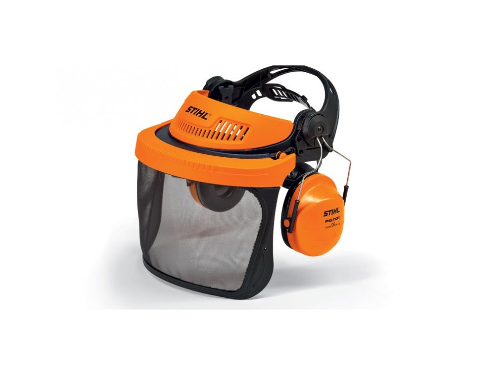 Profesionálna kombinácia, perfektná vyváženosť, nastaviteľná pre všetky veľkosti hlavy vďaka otočnému gombíku. Kryty sluchu sú oddeliteľné pre použitie v lete. Predná časť s odvetrávaním zabraňuje poteniu. Nový ergonomický dizajn zabezpečuje komfortné nosenie, nízka hmotnosť. Robustná ochrana tváre s perfektným výhľadom.EN 1731, EN 352, SNR 28 (H : 35; M : 26; L : 16) (do 108 dB(A))