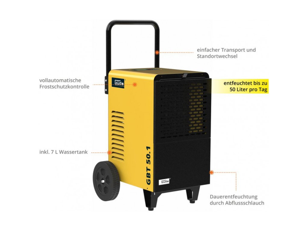 Vysušovač stavieb do uzavretých priestorov v pivniciach alebo na stavbách s plochou 50 až 120 m2. Výkon odvlhčovania až do 50 l za deň. Plnoautomatická kontrola ochrany proti mrazu, nastaviteľný hygrostat. Vysoká cirkuláciu vzduchu, umývateľný vzduchový filter. Integrovaná vodná nádrž s kapacitou 7 l. Funkcia automatického zastavenia. Odtoková hadica na nepretržité odvlhčovanie (vhodná na nepretržitú prevádzku bez dozoru). Veľká úspora energie na nepretržitú prevádzku.