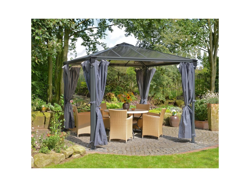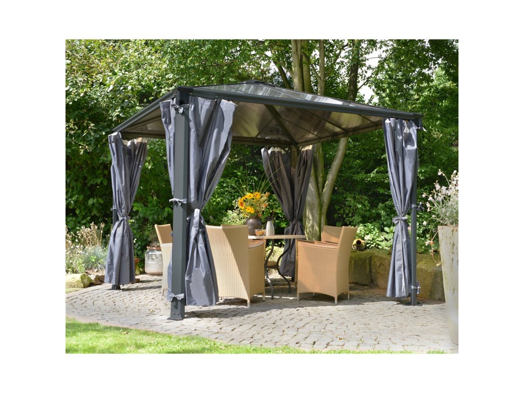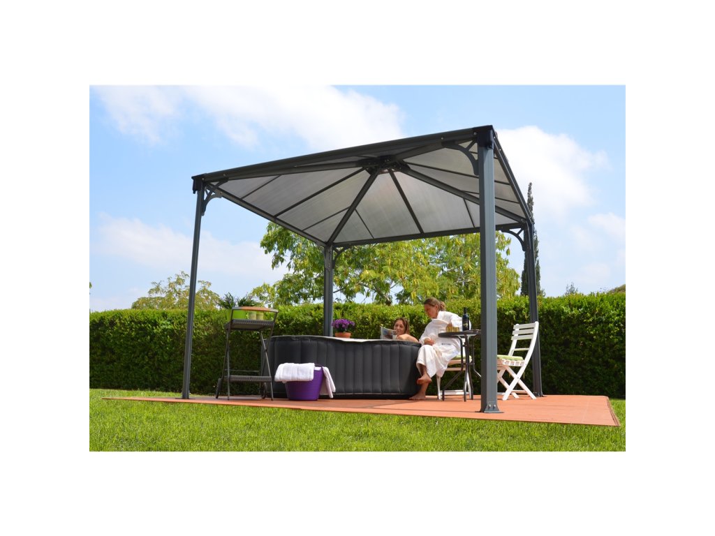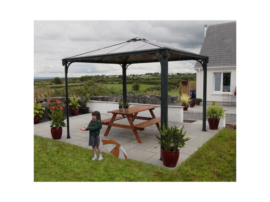 Stylový přístřešek pro vaši dokonalou relaxaci a posezení s přáteli Se zahradním altánem Palermo si můžete na zahradě vykouzlit nádherný a stylový relaxační koutek, kde se budete vždy rádi setkávat s rodinou či přáteli. • Skvělé pro klidné posezení, místo oslav, grilování při nepříznivém počasí, jako relaxační kout či jako zastřešení venkovní vířivky • V podstatě nezničitelná konstrukce z hliníkových profilů a nerozbitného 6 mm dvoukomůrkového polykarbonátu odolná proti větru, sněhu i kroupám • Elegantní šedý odstín střechy a antracitová barva rámu skvěle zapadnou do prostředí vaší zahrady • Integrovaný ventilační otvor podporuje proudění vzduchu a navíc spolehlivě odvádí kouř při grilování • Integrované háčky v kolejnicích jsou připravené pro instalaci závěsu či sítě proti hmyzu • Integrovaný systém okapů spolehlivě odvádí vodu • Snadné sestavení svépomocí ve 2 osobách během jediného dneDodatočné parametre