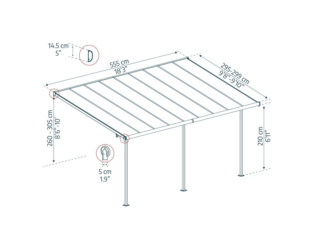 Elegantní, rychlé a levné řešení pro zakrytí vaší verandy Moderní a praktická hliníková pergola, která dlouho vydrží, je za skvělou cenu, výborně vypadá a postavíte ji ve dvou lidech za jedno odpoledne. • V podstatě nezničitelná konstrukce z hliníkových profilů a silného sendvičového polykarbonátu se 100% UV ochranou. • Unikátní systém nasunutí střešních panelů bez dalšího spojovacího materiálu a nutnosti lézt na střechu • Bezúdržbový hliníkový rám s galvanicky ošetřenými kovovými prvky je ošetřen práškovou barvou a je vysoce odolný vůči rezavění, plísním či mechům. • Díky nastavitelné výšce ukotvení a posuvným opěrným nohám vyhoví většině běžných verand • Možno využít z boku domu jako přístřešek pro auto Přidaná hodnota - nastavitelná a flexibilní Flexibilní rozměry a snadná montáž • Díky posuvným prvkům můžete přizpůsobit pergolu přesně vaší verandě • Lze upravovat výšku a hloubku a podélně posouvat nohy • Nejsou potřeba žádné základy, pouze pevný podklad pro ukotvení • Pokud je třeba, dají se (pouze u pergoly Sierra) střešní panely na zimu jednoduše vyndat (např. když přes zimu nejezdíte na chalupu a nejste schopni kontrolovat množství sněhu). • Pomocí jednoduchého propojovacího kitu (EZ LINK KIT) můžete spojit libovolný počet pergol Siera vedle sebe a vytvořit tak libovolně dlouhou pergolu • Pomocí bočního dílu můžete zakrýt pergolu z jedné nebo obou stran a zvýšit tak ochranu před větremDodatočné parametre