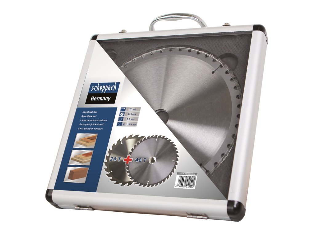 Sada 2 pilových kotoučů o průměru 315 mm, speciálně určených pro stolové pily Scheppach TS 310 a HS 120 o. Obsah kufříku: 315 x 30 x 2,8 mm / 24 zubů 315 x 30 x 2,8 mm / 48 zubů Kontaktní údaje výrobce / dovozce / zplnomocněného zástupce výrobce v EU: Scheppach GmbH Günzburger Str. 69, 89335 Ichenhausen, Germany email: service@scheppach.comDodatočné parametre