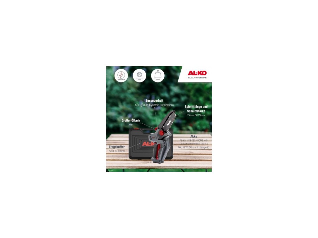 Mimoriadne praktická - akumulátorová mini reťazová píla AL-KO 18 V BOSCH KOMPATIBILNÁ PRE DOM A ZÁHRADU CSM 1815 Akumulátorová mini reťazová píla AL-KO CSM 1815 vás dokonale podporí pri rezaní a údržbe záhrady. Pracujte nezávisle od elektrickej energie. Ideálne na prerezávanie a orezávanie konárov. CSM 1815 je napájaná 18 V batériou AL-KO BOSCH Compatible pre dom a záhradu. V prípade potreby môžete tento batériový systém použiť na prevádzku rôznych strojov AL-KO s jednou a tou istou batériou - a ušetriť peniaze. Pohodlné mazanie reťaze podľa potreby. Naša vynikajúca technológia SDL - Smart Dynamic Lubrication - maže reťaz píly podľa potreby. Stačí stlačiť primer ( pumpičku) a reťaz sa namaže olejom. Vďaka 15 cm dlhej lište a výkonnému 18 V Li-Ion akumulátoru sa nemusíte báť ani väčších konárov. Hrúbka rezu až do 13 cm. Hladinu oleja v 30 ml olejovej nádržke možno ľahko kontrolovať cez okienko. Špičková bezpečnostná ochrana vás chráni pred zranením. Vyvážená rovnováha, otváranie bočného krytu bez použitia náradia a bohaté vybavenie, ako je kufrík na prenášanie a 60 ml oleja na reťaz, robia z našej mini reťazovej píly ideálneho pomocníka v dome a na záhrade. Už žiadne nudné rezanie. S radom akumulátorov AL-KO 18 V Bosch Home & Garden Compatible ste vďaka nášmu početnému záhradnému náradiu dokonale vybavení pre každé použitie. Navyše sú batérie a nabíjačky kompatibilné so všetkými zariadeniami od rôznych výrobcov, ktoré pracujú s 18 V batériovým systémom Bosch Home and Garden. Batéria a nabíjačka sú súčasťou balenia. S 18 V lítium-iónovým akumulátorom AL-KO BOSCH máte k dispozícii rôzne časy chodu a nabíjania, pretože si môžete vybrať zo štyroch rôznych veľkostí Ah. K dispozícii sú batérie s kapacitou 2,5/4/5 a 6 Ah. Naša dvojročná záruka výrobcu zahŕňa aj batériu tohto zariadenia. Kúpte si akumulátorovú mini reťazovú pílu AL-KO 18 V CSM 1815 Akumulátorovú mini reťazovú pílu CSM 1815 si jednoducho zakúpte v našom online obchode alebo u niektorého z našich špecializovaných predajcov.Jedinečné mazanie SDL® (Smart Dynamic Lubrication) na pohodlné mazanie reťaze podľa potrebyDĺžka lišty 15 cm pri rýchlosti reťaze 7 m/sRýchla kontrola hladiny oleja cez kontrolné okienko na olejovej nádržiVýkonný rezný výkon až do 130 mmVeľká 30 ml nádrž na olej18 V systém BOSCH HOME AND GARDEN COMPATIBLE (batéria a nabíjačka sú súčasťou dodávky)Dodáva sa s kufríkom a 30 ml bio reťazového olejaDodatočné parametre