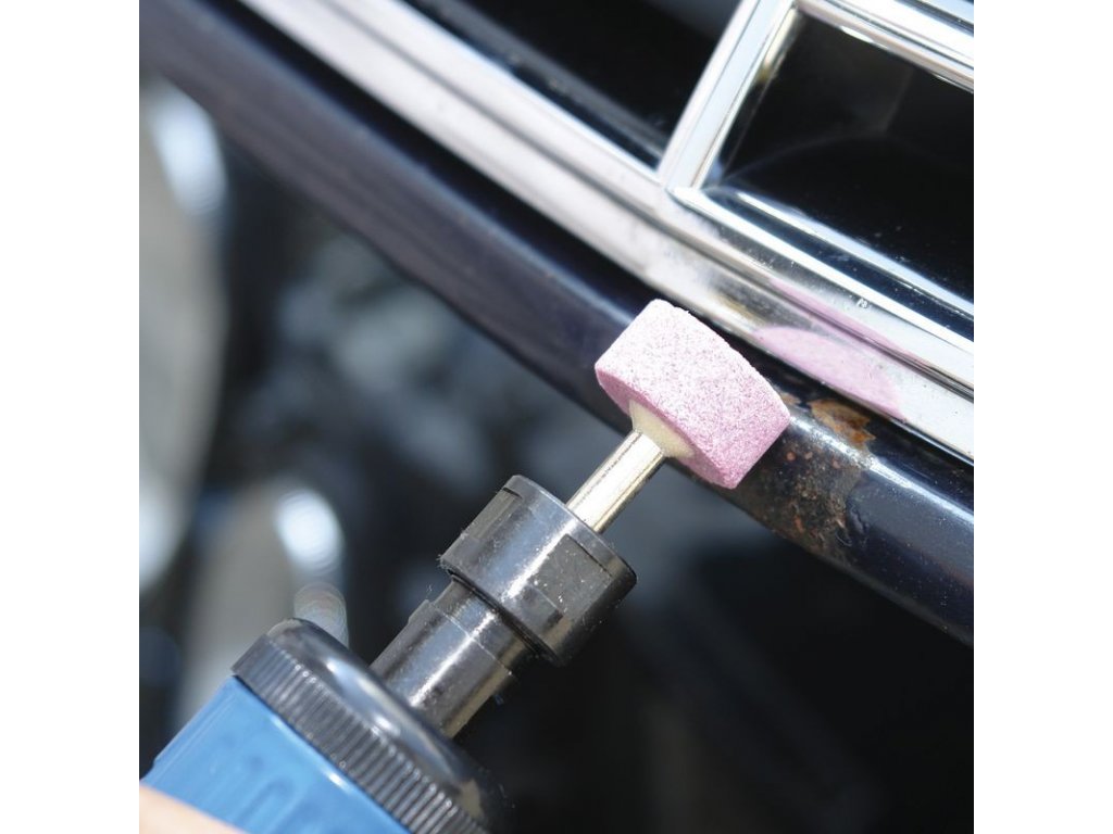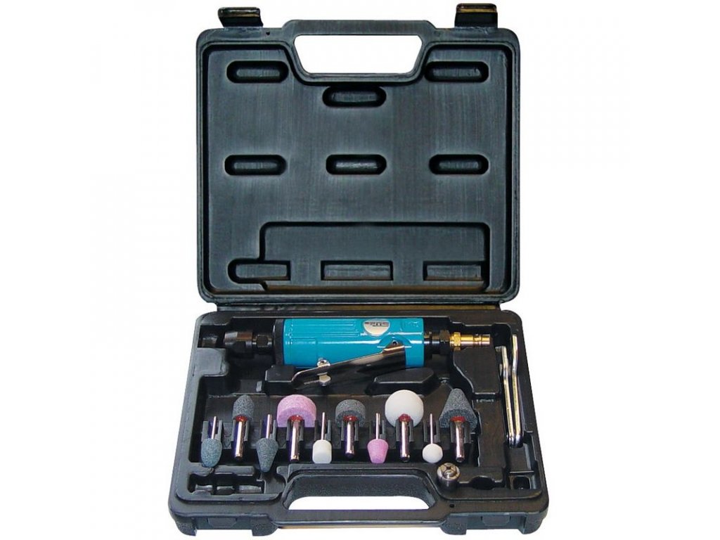 Tyčová pneumatická brúska s príslušenstvom, plynulá regulácia otáčok, prípojná vsuvka, 10 brúsnych nadstavcov rôznych tvarov, upínacia klieština 3 mm, 2 kľúče, v plastovom kufríku.