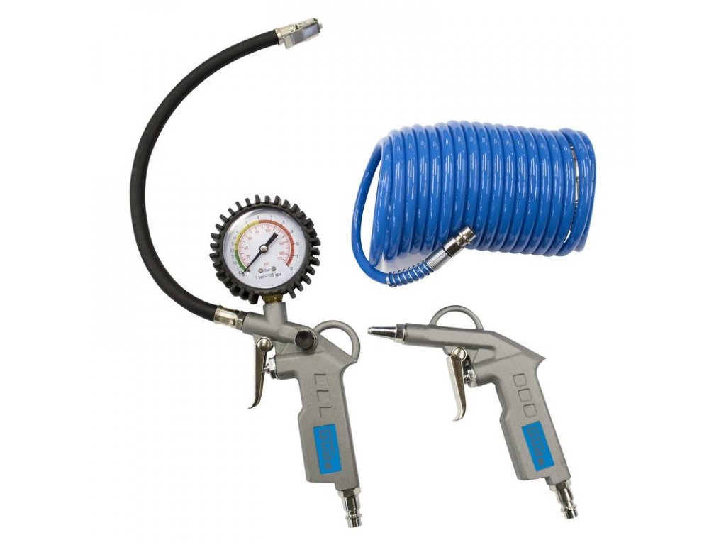 Hustilka pneumatík s rýchlospojkou. Vyfukovacia pištoľ s rýchlospojkou. Špirálová hadica s rýchlospojkou.Prípojný závit: 1/4"Maximálny pracovný tlak: 10 barDĺžka špirálovej hadice: 5 mRozmery (DxŠxV): 248 x 165 x 103 mmHmotnosť netto/brutto: 0,72 kg/0,84 kgDodatočné parametre