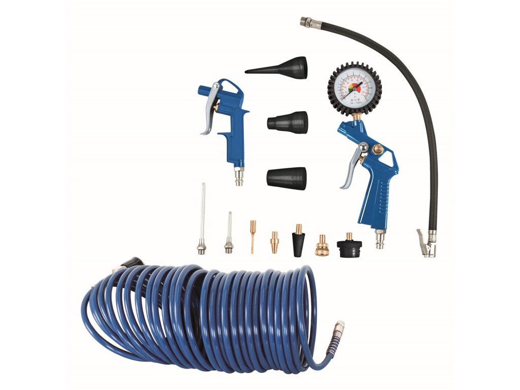 Rozšířená sada příslušenství s bohatým sortimentem trysek a spirálovou hadicí. Nástroje jsou vyrobené s kvalitních slitin kovů a jsou opatřeny rychlospojkami. Sada obsahuje: 5 m spirálová hadice pro snadné propojení nástrojů Pistole na plnění pneumatik s manometrem s gumovou ochranou, duální stupnicí (bar/PSI) a výpustným tlačítkem Ofukovací pistole pro vyčištění nebo vysušení i hůře přístupných míst 10x sada různých trysek a 1x hadice k pistoli na plnění pneumatikDodatočné parametre