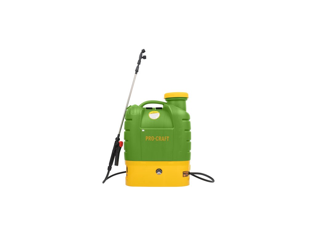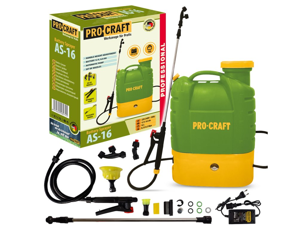 Aku postřikovač Procraft AS-16 je určený na postřik, rozprašování přípravků a prostředků, ošetřování rostlin a stromů, hubení škůdců a plevele, dezinfekci a čištění prostorů. Po vyprázdnění nádoby dojde k automatickému vypnutí. Spolehlivé čerpadlo s nastavitelným průtokem až 3,1 l/min a tlakem až 5,5 bar a s integrovaným kontrolním barometrem. Součástí dodávky je nabíječka a baterie umístěná bezpečně uvnitř stroje v odolném obalu proti vlhkosti. Doba provozu až 7h v závislosti na intenzitě práce a pracovním tlaku. Postřikovač má teleskopickou kovovou trubicí a je vyroben z kvalitních materiálů, které pod tlakem nepraskají. Je vybaven gumovým těsněním, které má větší odolnost než standardně dodávané silikonové těsnění. V balení jsou náhradní vyměnitelné trysky, trysky na různý roztřik, praktický zádový popruh, těsnící kroužky a komfortní spouštěcí pistole. Nádoba postřikovače je průsvitná, takže při práci vidíte objem kapaliny. Balení karton.