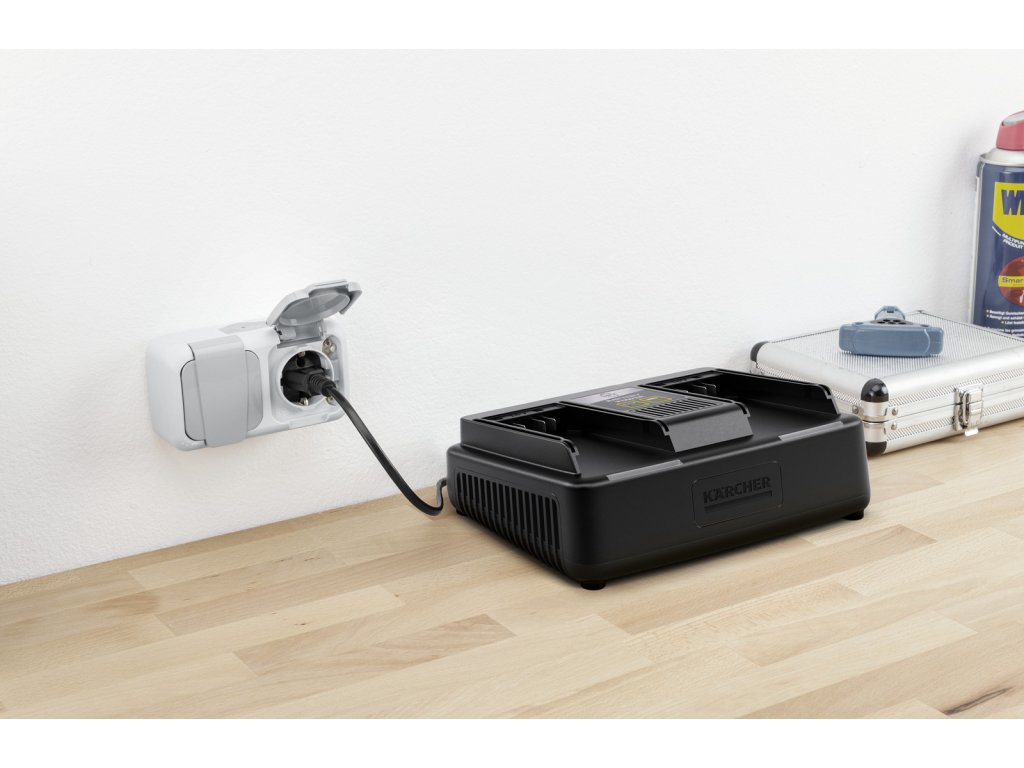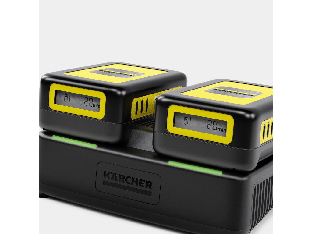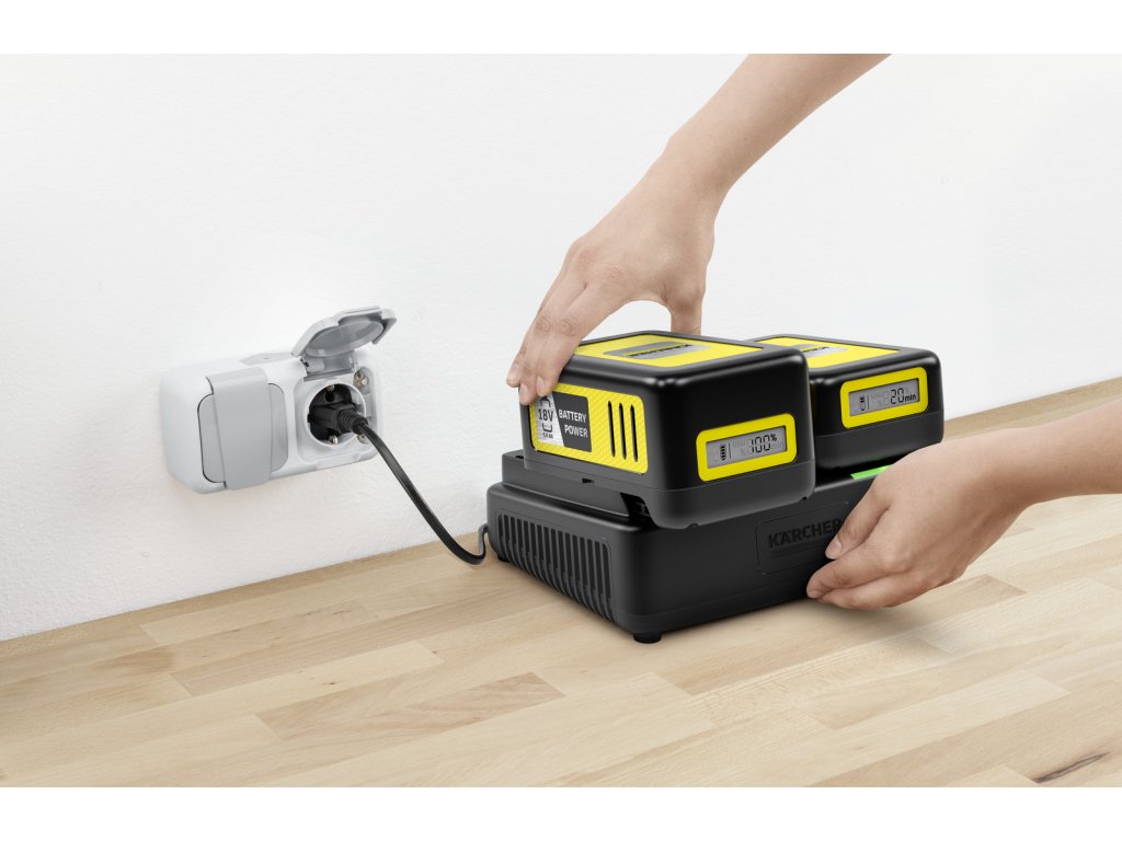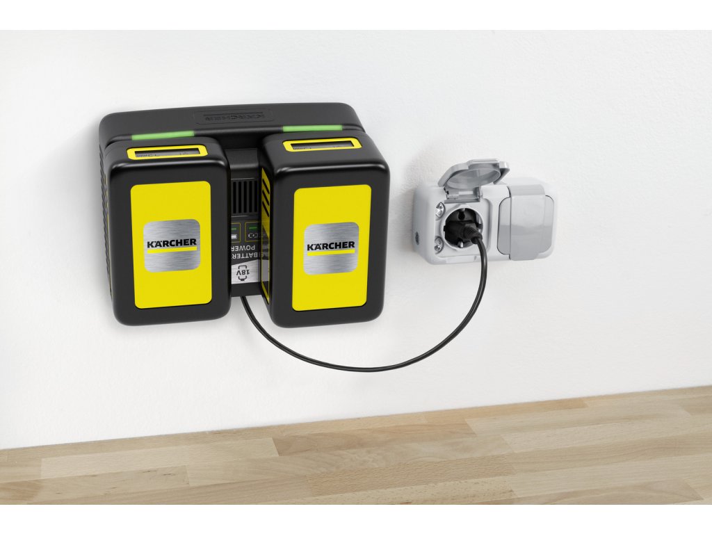 Duálna rýchlonabíjačka dokáže nabíjať 2 batérie súčasne vďaka 2 slotom. Dá sa ľahko pripevniť na stenu pomocou vstavaného nástenného držiaka. Rýchlonabíjačka nabije 18 V/2,5 Ah batérie Kärcher Battery Power na 80 % len za 44 minút. Dá sa použiť aj na dobíjanie všetkých ostatných 18 V vymeniteľných batérií na 18 V batériovej platforme Kärcher.Dodatočné parametre